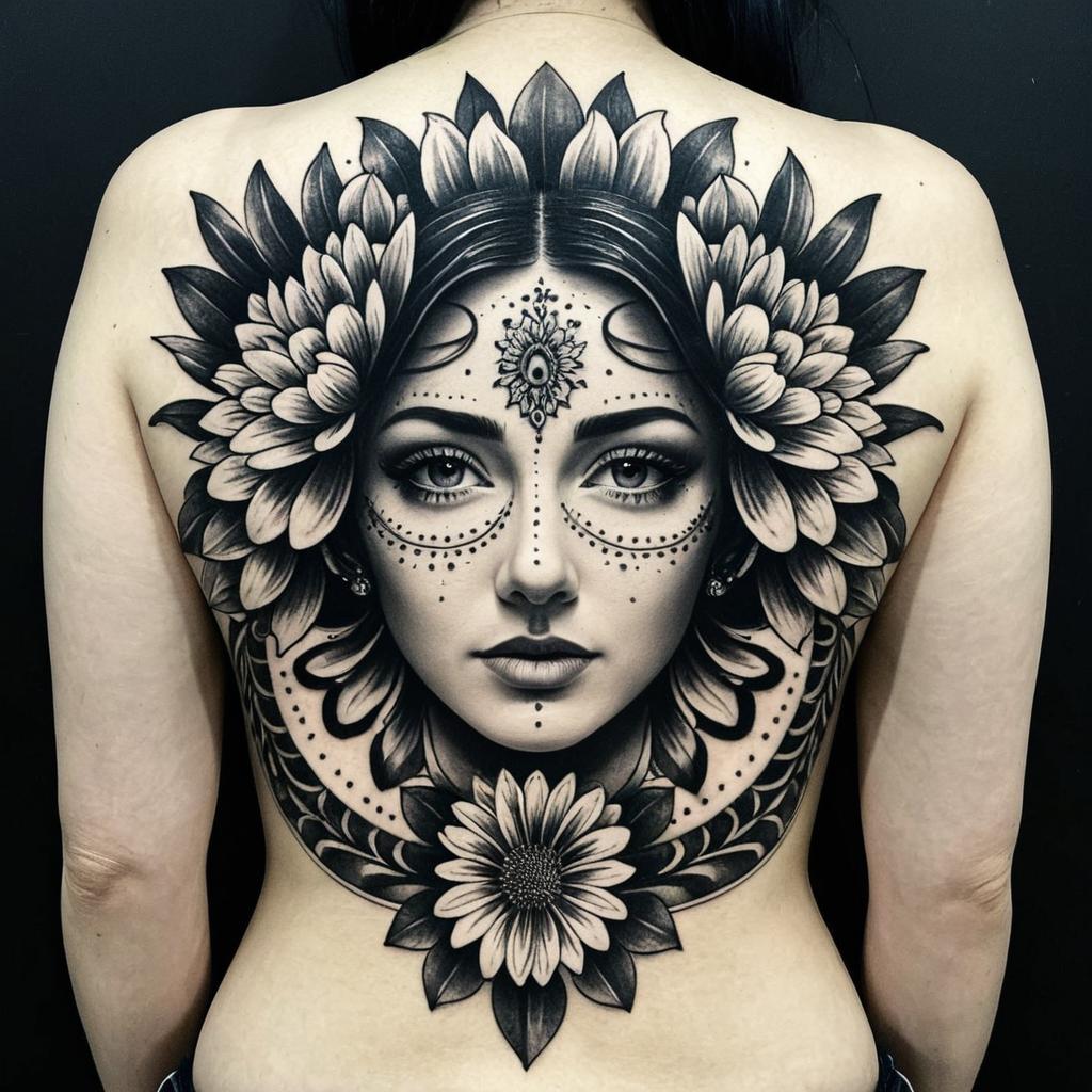 Spontaneous full back tattoo , symetrical, womans face , no pupils, filigree surrounding blending into symetrical Chrysanthemum flowers, negative space , stylised , in the style of juilan bogdan noir corpus,