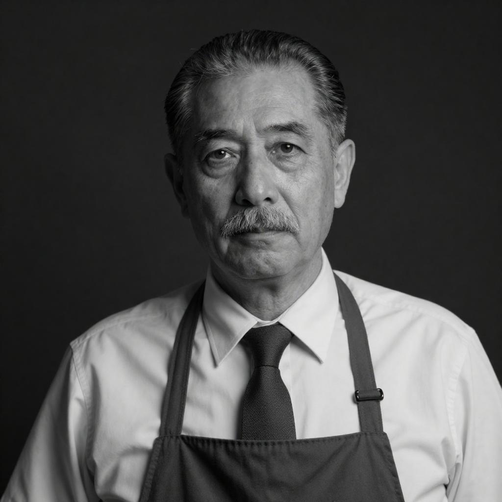 Black-and-white photograph of an older man with short, slicked-back hair, mustache, wearing a light shirt, dark tie, and apron. Dark background, direct light from above. Serious expression. Upper body, slightly turned to the right.