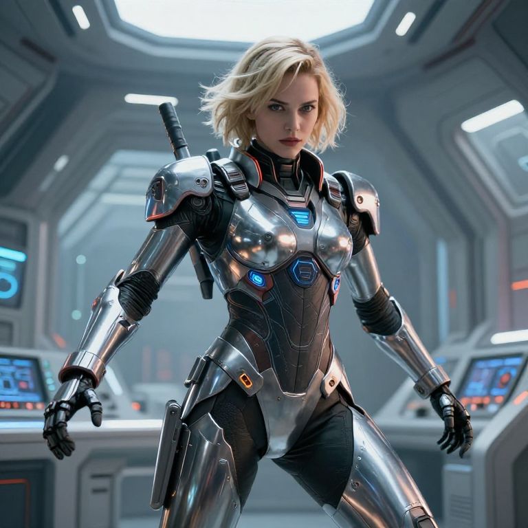 Photorealistic CGI of a blonde woman in a futuristic, metallic, black and silver armored suit, standing confidently in a high-tech spaceship control room.