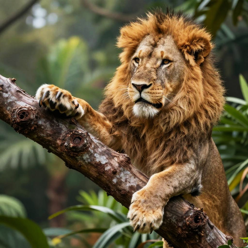 Lion toes gripping a tree branch, powerful lion paw with pronounced claws and coarse fur, vibrant jungle background, dynamic action pose, photorealistic rendering