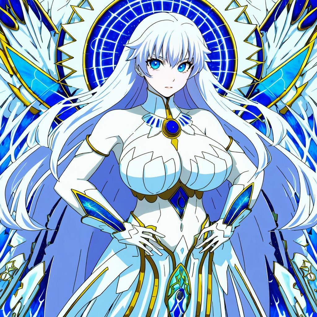 Artoria caster (third ascension) (fate), fate/grand order, 1girl, green eyes, blonde hair, long hair, very long hair, ahoge, twintails, hair bow, medium breasts, small breasts, black gloves, white dress, armored dress, blue bow, long sleeves, blue ribbon, forehead mark, crown, by artist moke ro, anime