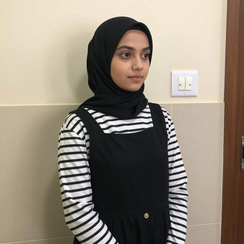 Photograph of a young woman with fair skin and brown eyes, wearing a black hijab and a light gray ribbed long-sleeve top. She stands against a ured, beige wall with electrical outlets above her. Her expression is neutral, and she is positioned slightly to the right, with a patterned black and white fabric visible at the bottom.