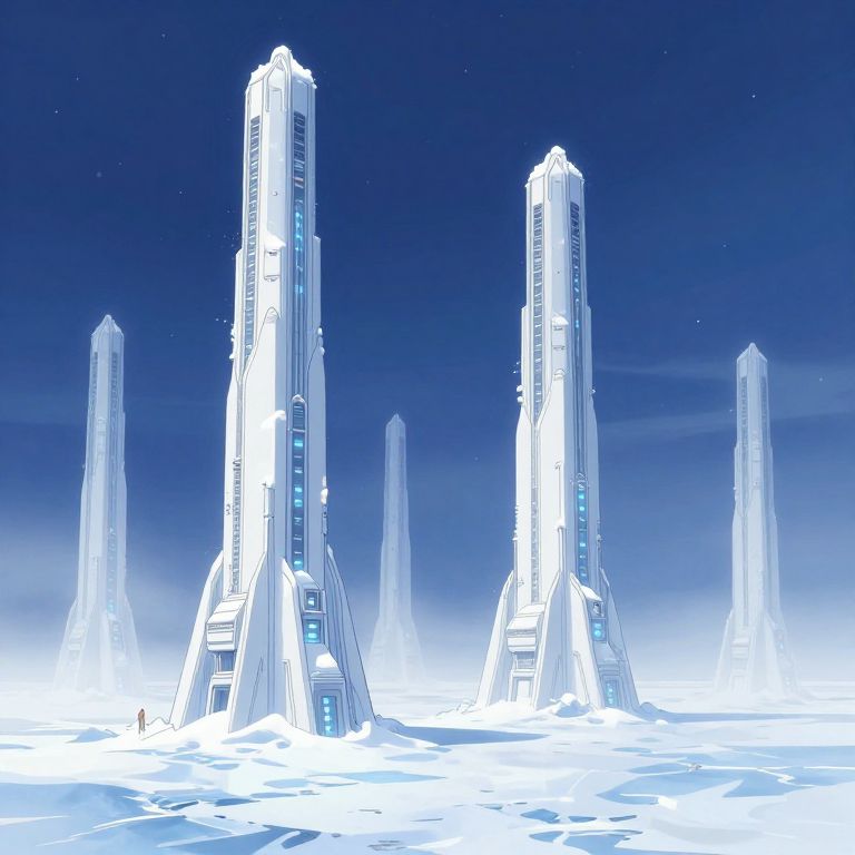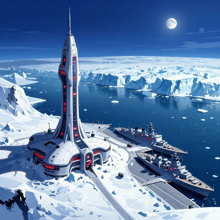 This digital illustration depicts a futuristic, cylindrical space station with a sleek, white exterior and red accents, standing on a snow-covered ice plateau. The station is surrounded by a blue, icy sea with floating icebergs and distant mountains. A dock with several ships and vehicles is located to the right. The background features a dark, starry sky with a visible moon. The illustration uses bright, contrasting colors and sharp lines, giving it a hyper-realistic, yet slightly stylized appearance. The scene conveys a sense of isolation and advanced technology in a harsh, polar environment.