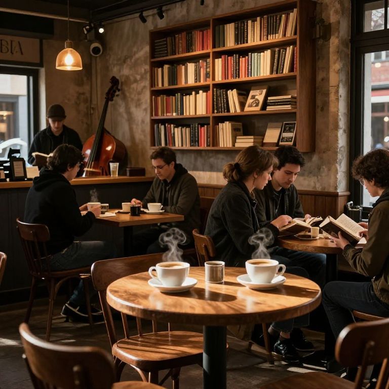 Photograph of a cozy, dimly-lit coffee shop with a rustic, wooden interior. Four patrons, dressed in dark jackets and jeans, sit at wooden tables, reading books or laptops. Two steamy white coffee cups and a mug sit on the table in the foreground. A musician with a double bass stands in the background near a large bookshelf filled with books. Warm, yellow pendant lights hang from the ceiling. The textured, beige walls and large windows add to the inviting atmosphere. The image has a slightly high-contrast, vintage style.