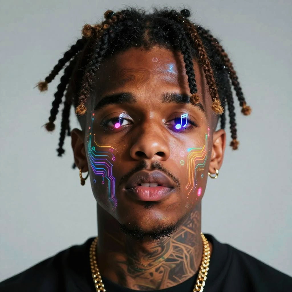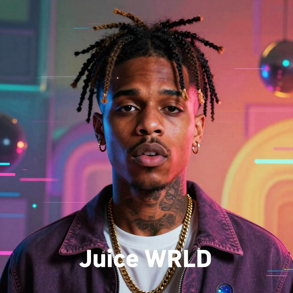 Juice WRLD AI art inspired digital illustration, fluid shapes and electric energy flows surrounding expressive figure, glowing neon outlines, dark cityscape with futuristic holograms, emotional and introspective mood, detailed light refractions