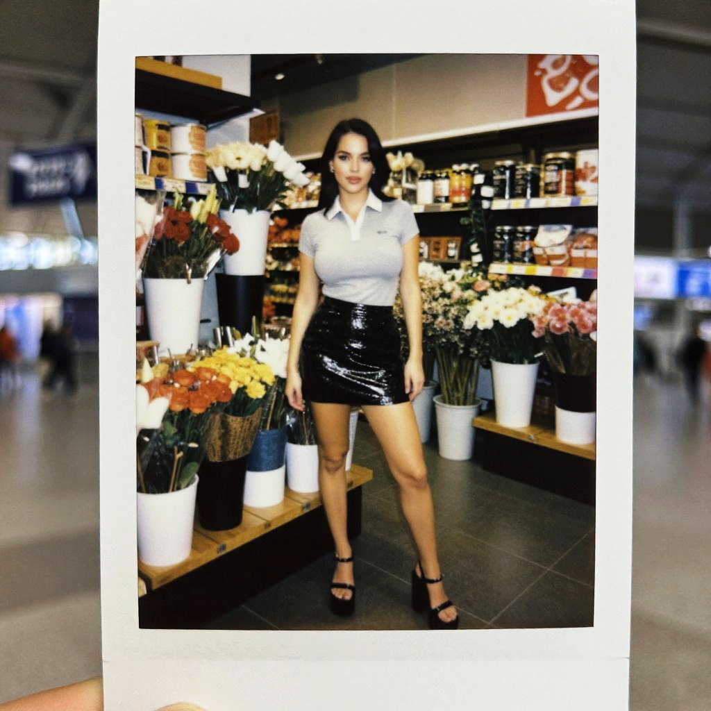 A woman, casual chic in a fitted grey polo with a white collar, black faux leather mini skirt, and chunky black platform sandals, captured in the vibrant style of instant film at a flower shop in an airport terminal. Sexy. Pretty face and beаutiful eyes. Big breasts