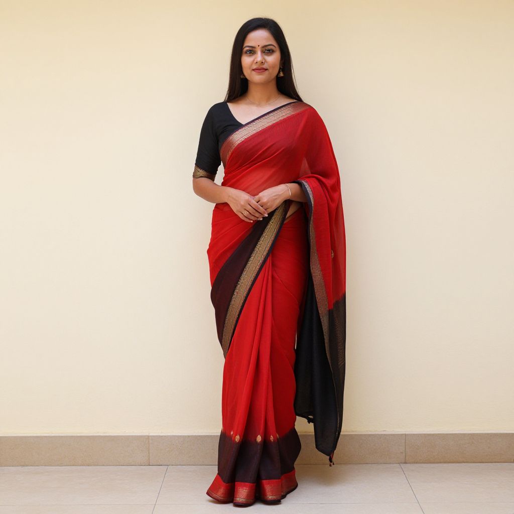 Photograph of a South Asian woman standing against a plain, cream-colored wall. She has long, straight black hair, medium brown skin, and wears a traditional red and black sari with gold trim. The sari's red fabric is draped over her left shoulder, while the black border and gold trim accentuate the edges. She has a black blouse with short sleeves underneath. She stands with her right hand resting on her left arm, her left hand holding the sari's edge. She wears red shoes and has a calm, confident expression. The floor is tiled in light beige.