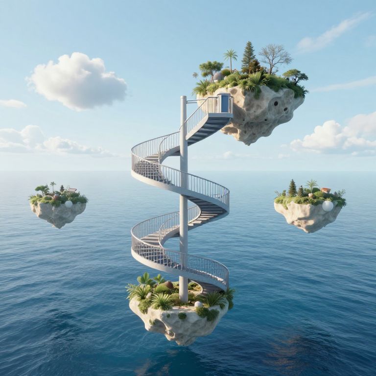A staircase spirals from the ocean floor into the sky, connecting islands that drift lazily like clouds, each floating on a different emotion.