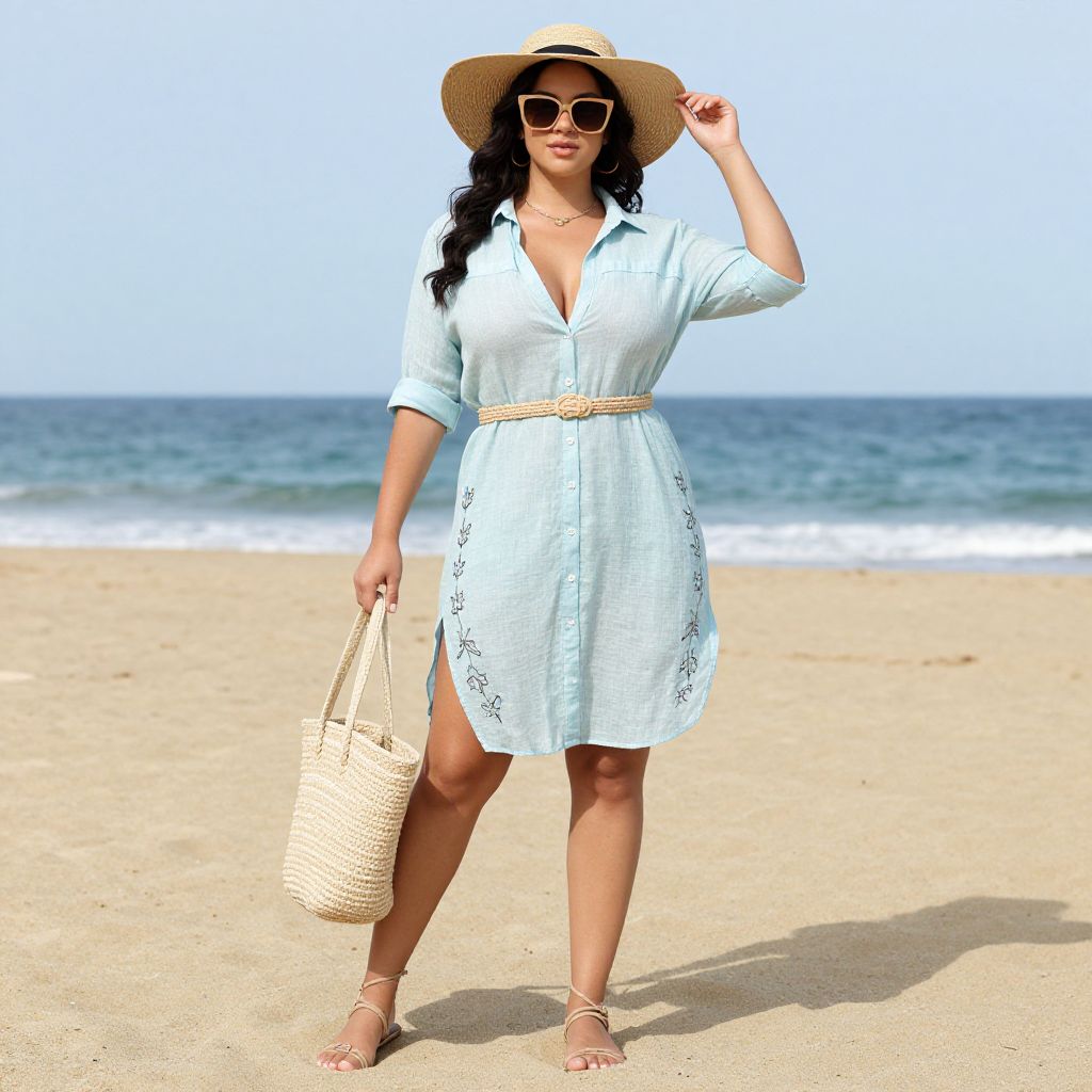 Full body shot, Curvy woman, lightweight linen button-down shirt dress, soft pastel colors, oversized fit, rolled-up sleeves, knee-length hem, breathable fabric, side slits, delicate floral embroidery, cinched waist with a woven belt, wide-brimmed straw hat, oversized sunglasses, strappy sandals, beach tote bag, sun-kissed skin, relaxed summer vibe Sexy. Pretty face and beаutiful eyes. Big breasts
