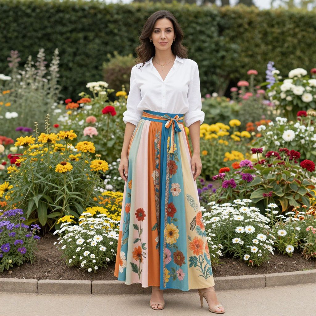 Woman seated gracefully on a classic wooden bench with ornate black wrought iron arms, wearing an elegant off-white gown with puffed sleeves and a black sash, set against a serene park backdrop featuring lush green grass, scattered trees, and a paved pathway.