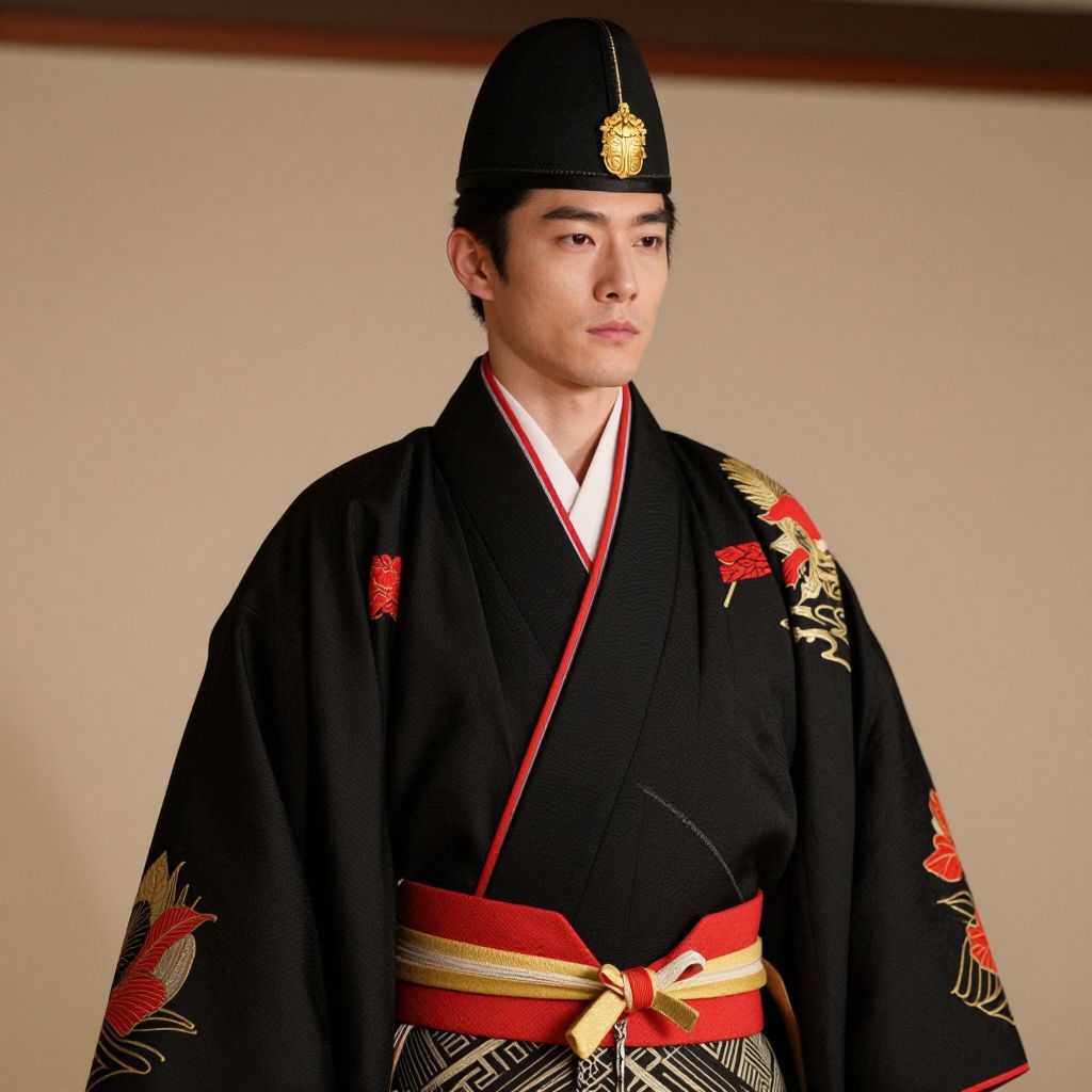 A male figure wearing a traditional black kimono with intricate red and gold embroidery, paired with a matching black hat adorned with a prominent gold emblem. The kimono is fastened with a red and gold belt, emphasizing the cultural and formal elegance of the attire. The figure is depicted in a stylized, serene pose, highlighting the meticulous craftsmanship and symbolic significance of the clothing. The background is minimal, focusing on the detail and texture of the garments to convey a sense of traditional Japanese aesthetics.