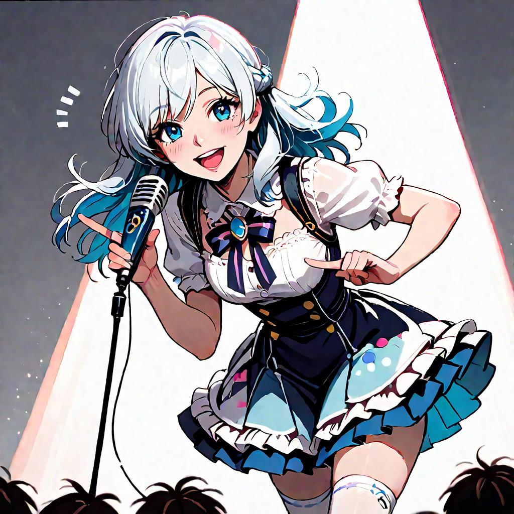 Illustration of a cheerful anime female idol with white and blue hair, wearing a stylish navy and white dress with short puffed sleeves and thigh-high socks. She is holding a vintage microphone and smiling brightly, pointing towards the viewer while standing in a white spotlight.
