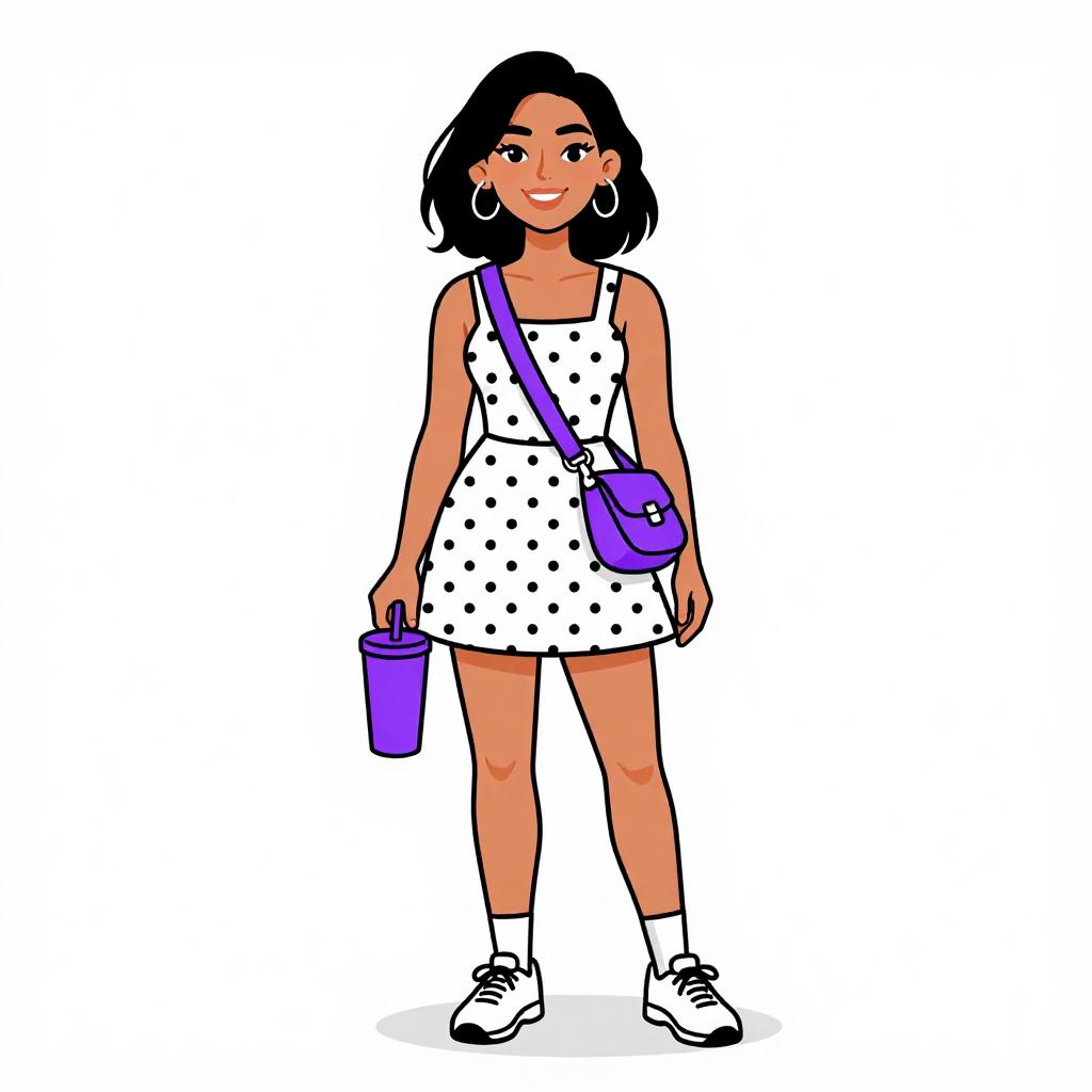 Digital illustration of a smiling young woman with tan skin and black shoulder-length hair. She wears a sleeveless, white, polka-dotted dress, white ankle socks, and white sneakers. She carries a purple crossbody purse with a strap over her right shoulder and holds a purple water bottle in her right hand. She wears large hoop earrings. The background is plain white, emphasizing the character. The art style is colorful and cartoonish, with bold outlines and vibrant colors.