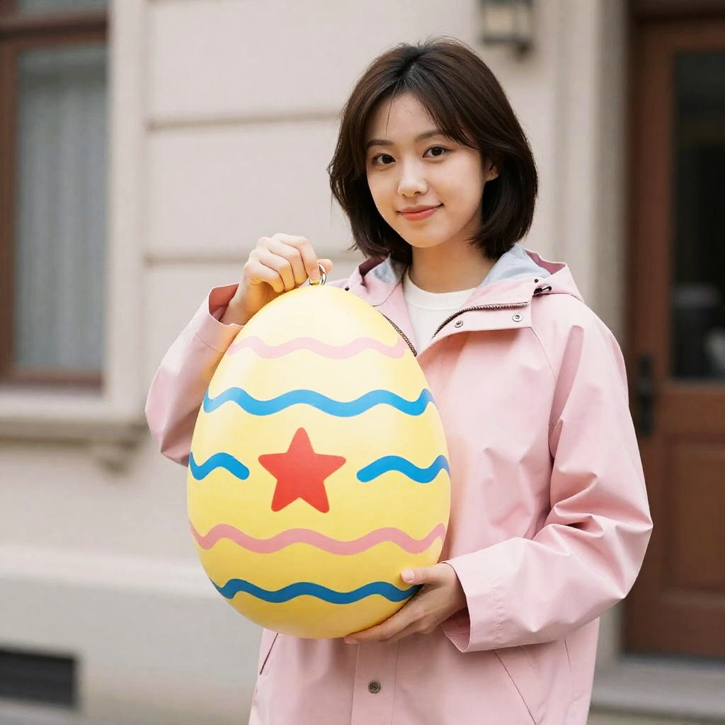 Easter Egg Costume Purse, woman in pink raincoat holding a large painted egg in front of a building