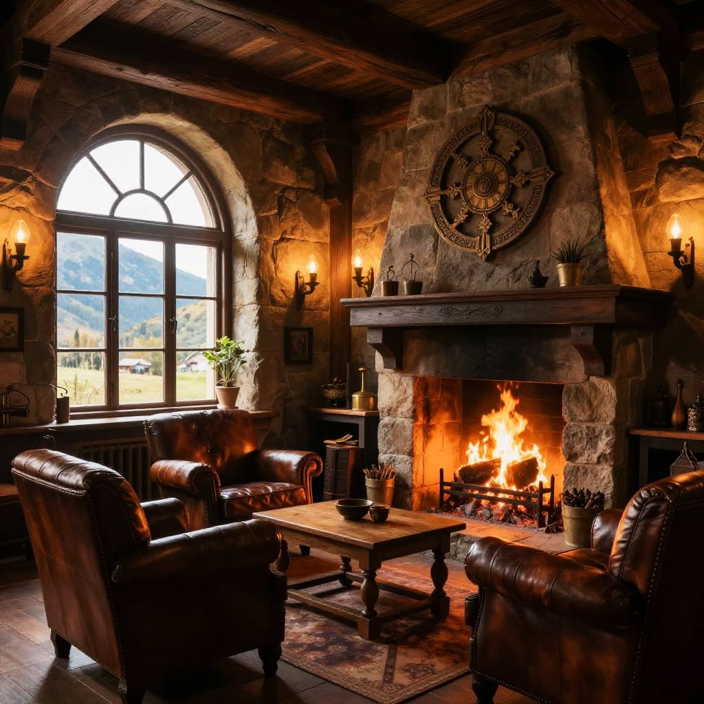 Cozy, rustic living room with stone walls, roaring fireplace, leather armchairs, wooden coffee table, arched window, and warm, ambient