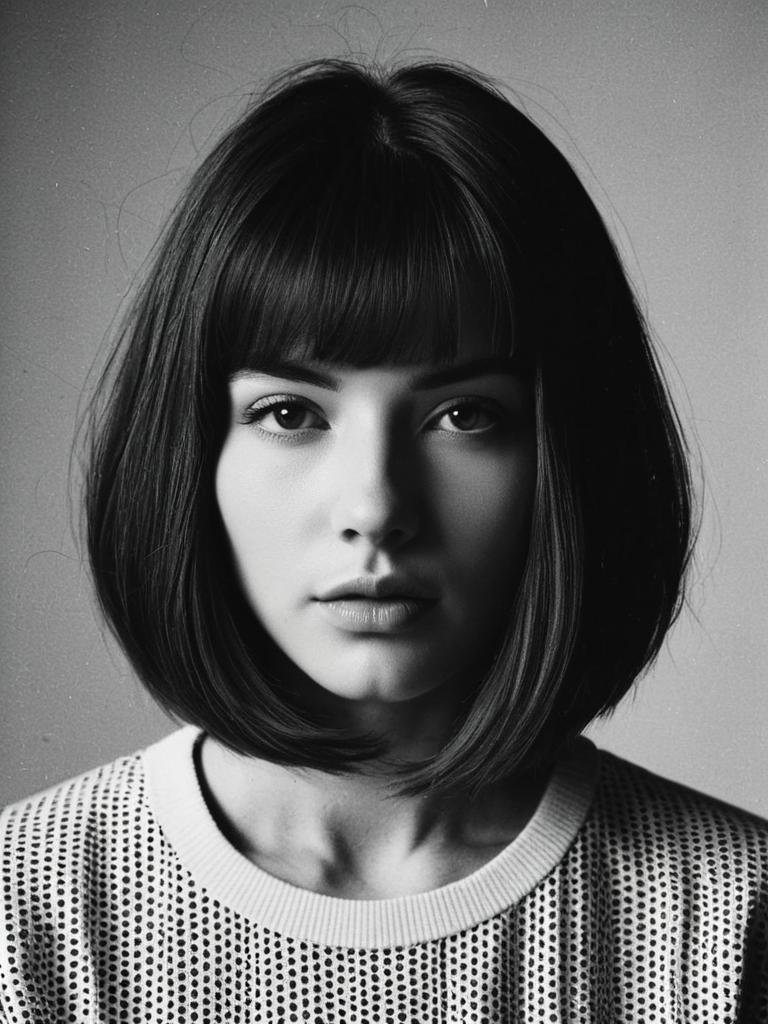 Black and white photorealistic studio portrait of a young woman with a long bob hairstyle. She is wearing a patterned zigzag top, with a neutral facial expression, set against a plain background. The lighting highlights her facial features with cinematic realism.