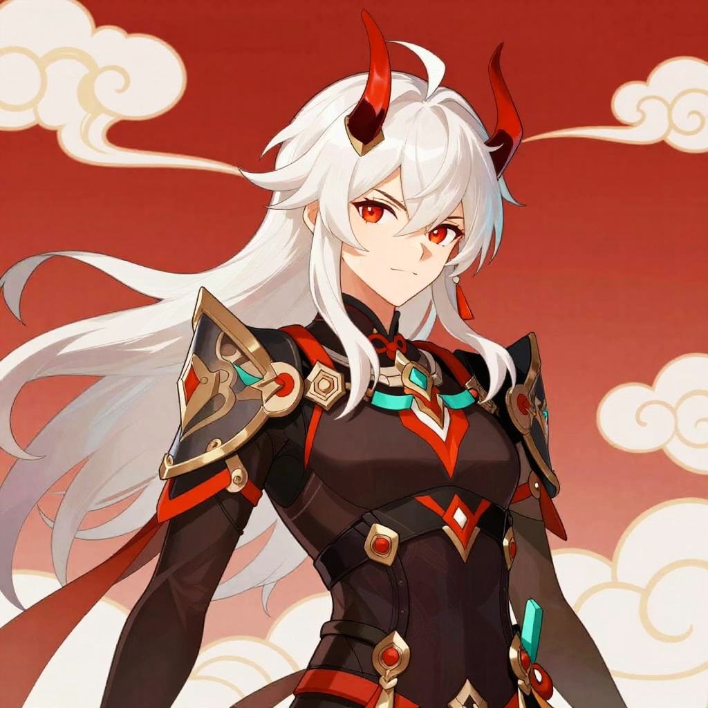 Digital anime-style drawing of a white-haired female character with red eyes and red horns. She wears a black, form-fitting armor with gold and red accents, including intricate shoulder plates and a turquoise pendant. Her long hair flows past her shoulders, and she stands against a vibrant red background with white, cloud-like shapes. Her expression is serious and determined. The character's design and color palette evoke a fantasy or demonic theme. The art style is crisp and vibrant, with strong, clean lines and a polished finish.