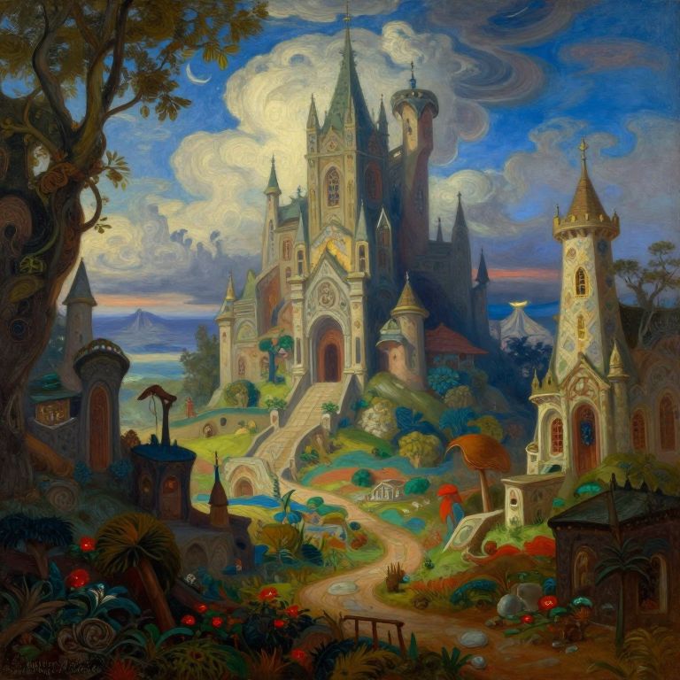 Imagine an oil painting that embodies the essence of J.R.R. Tolkien's Middle-earth through surreal landscapes, reminiscent of the whimsical world created by a master surrealist artist. This scene is captured from an unconventional perspective, akin to a 'bug's-eye view', enhancing the emotional spectrum between serenity and awe as it intertwines magical realism with age-old mythologies. The color palette is rich, combining vibrant earth tones with celestial blues, while intricate details unveil concealed stories within the mystifying architecture of these fantastical realms, invoking both comfort and enchantment in this harmonious fusion of dreamlike visions and legendary tales.