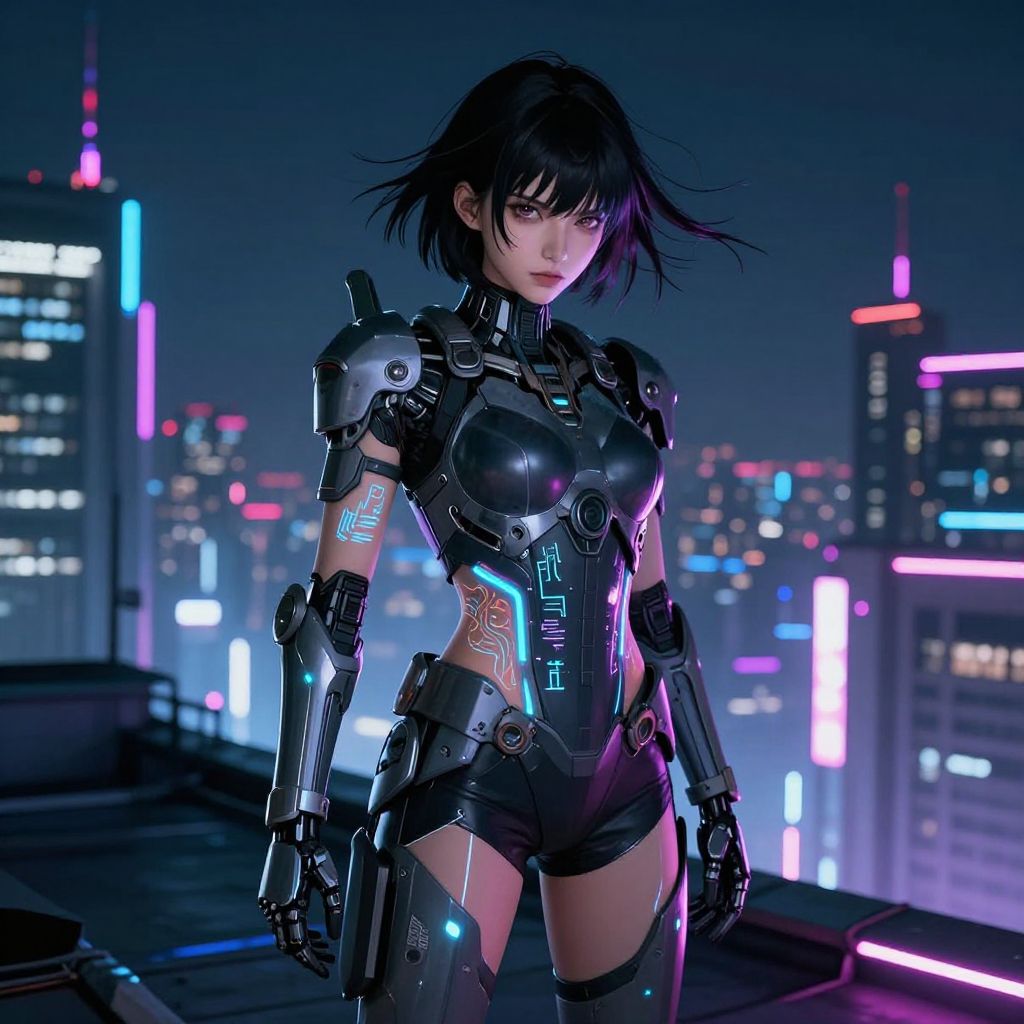 Sci fi anime girl standing on a neon-lit rooftop, futuristic urban skyline at night, armored exoskeleton, holographic tattoos glowing, intense gaze, wind blowing her hair