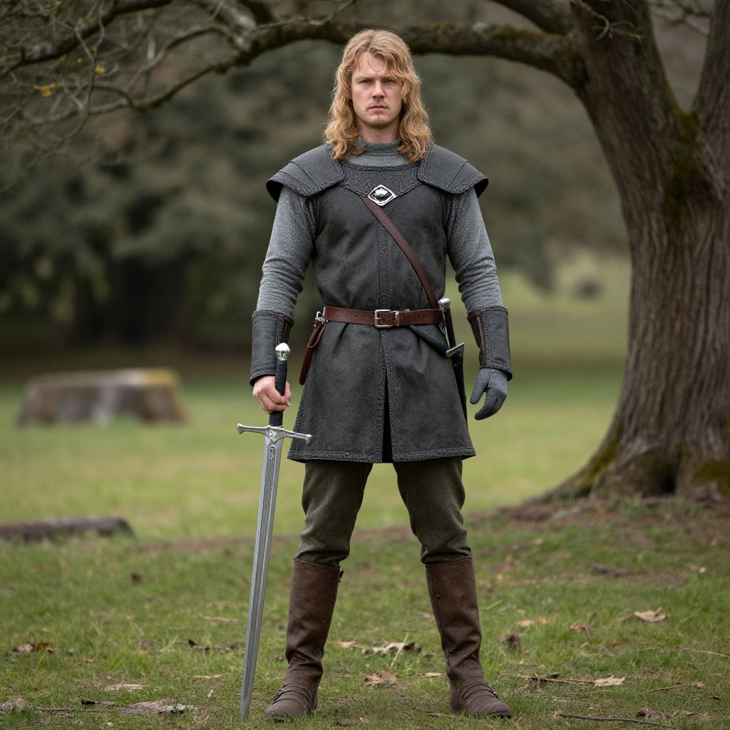 Lotr strider costume, male in a medieval outfit with a sword and a sword