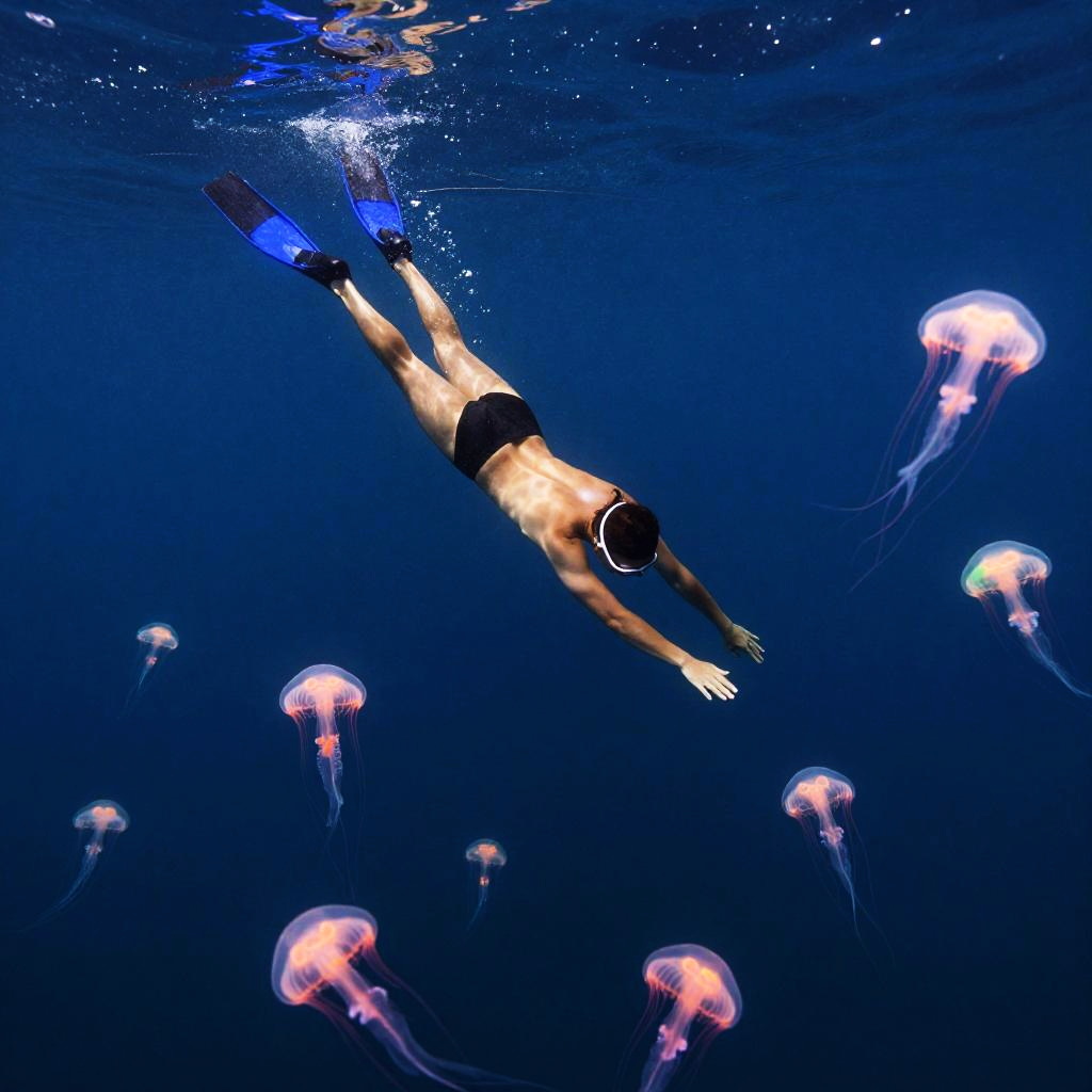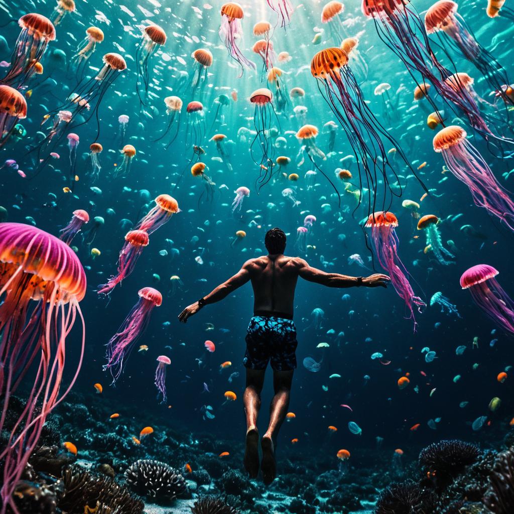 Underwater photograph of a lone swimmer surrounded by a multitude of neon-colored jellyfish in a deep blue ocean. The swimmer, wearing dark patterned swim shorts, is captured from behind with arms outstretched, emphasizing the vastness of the underwater scene. The jellyfish display bright hues of orange, pink, and purple with long tentacles, creating a mesmerizing and surreal marine environment with hyper-realistic detail and vibrant colors.