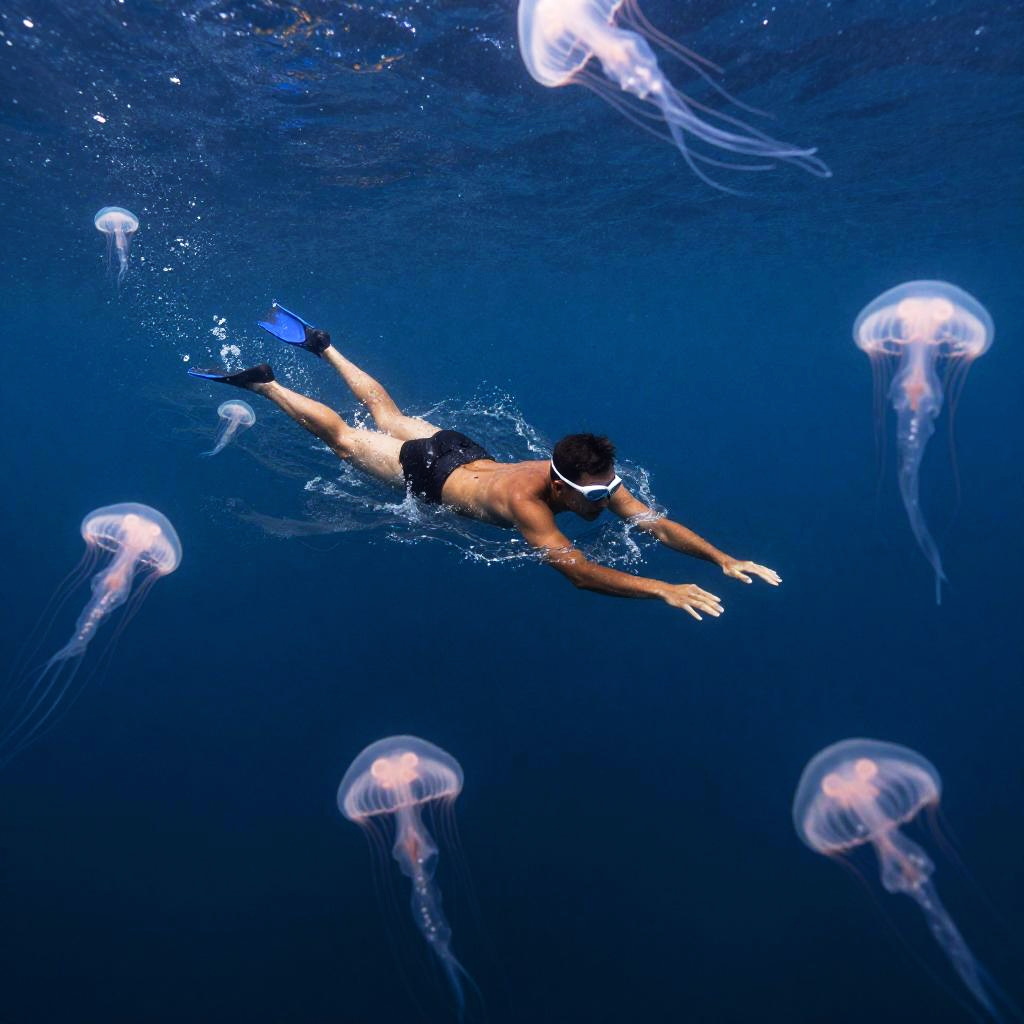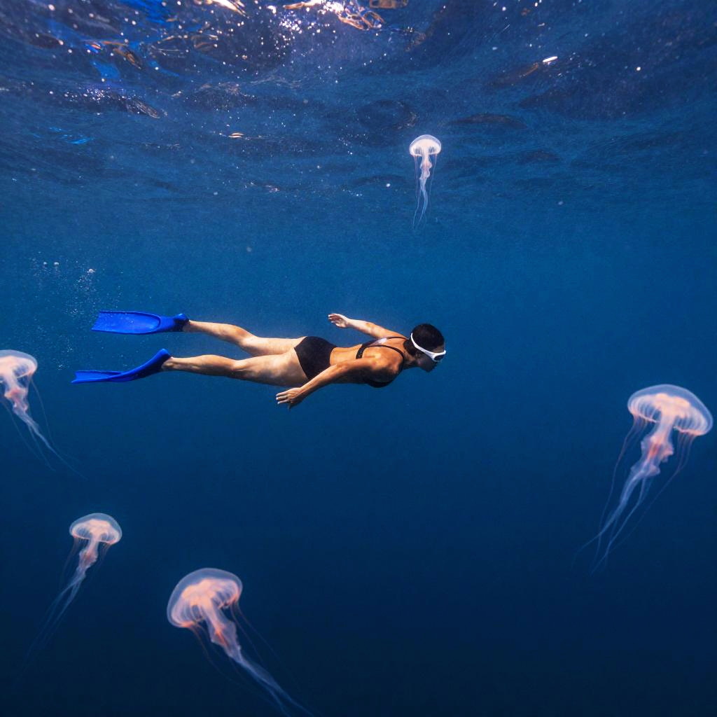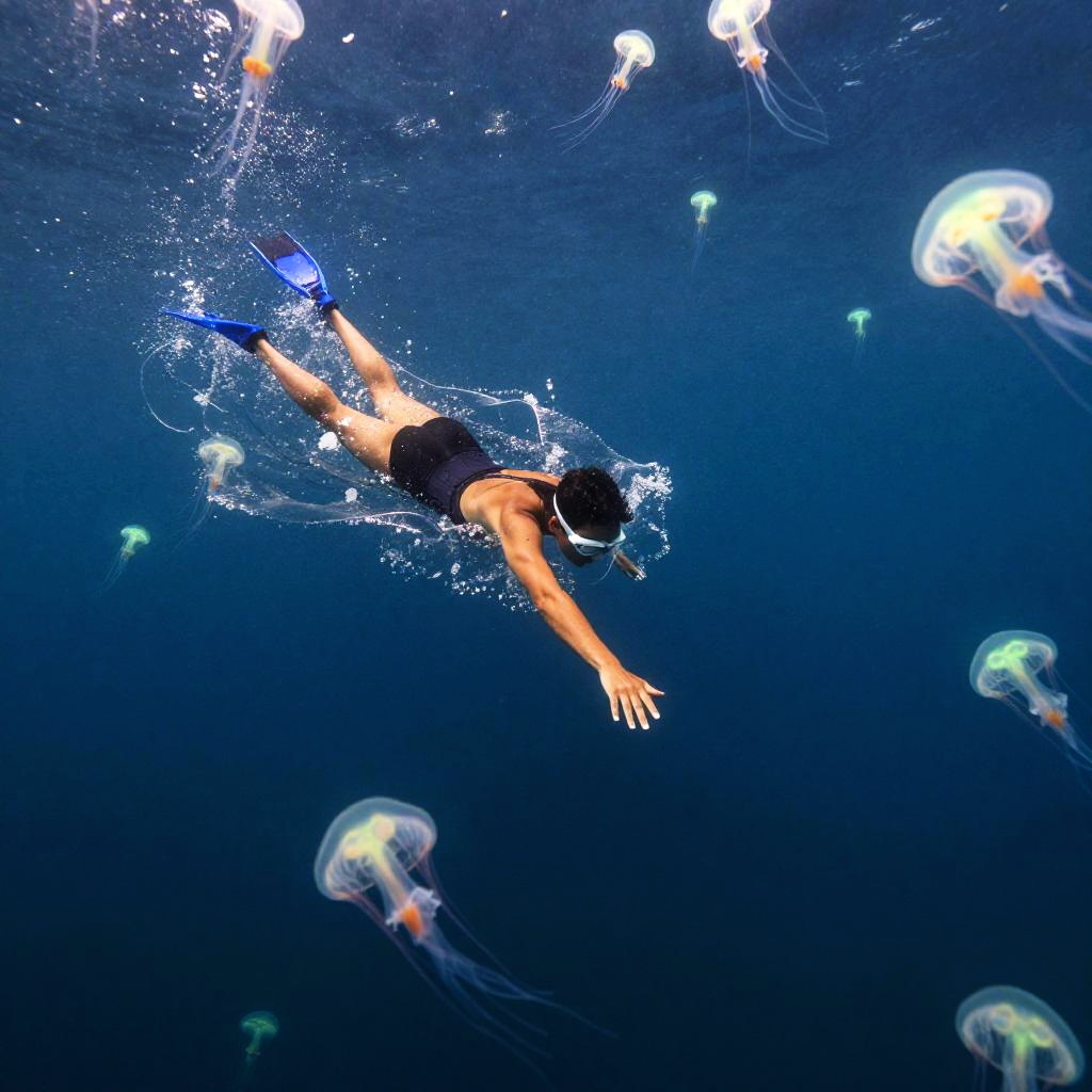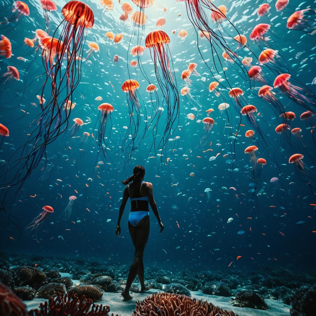 The photograph captures a lone swimmer in the ocean surrounded by thousands of neon-colored jellyfish, ultra vibrant shot with an 85mm lens and a shallow depth of field to emphasize the beauty and isolation of the subject. Shot in Super-Resolution and ProPhoto RGB with sharp focus, the image is ultra-realistic, with hyper-realistic textures that enhance the photorealistic detail. The final image is a full-body shot with a cinematic composition.