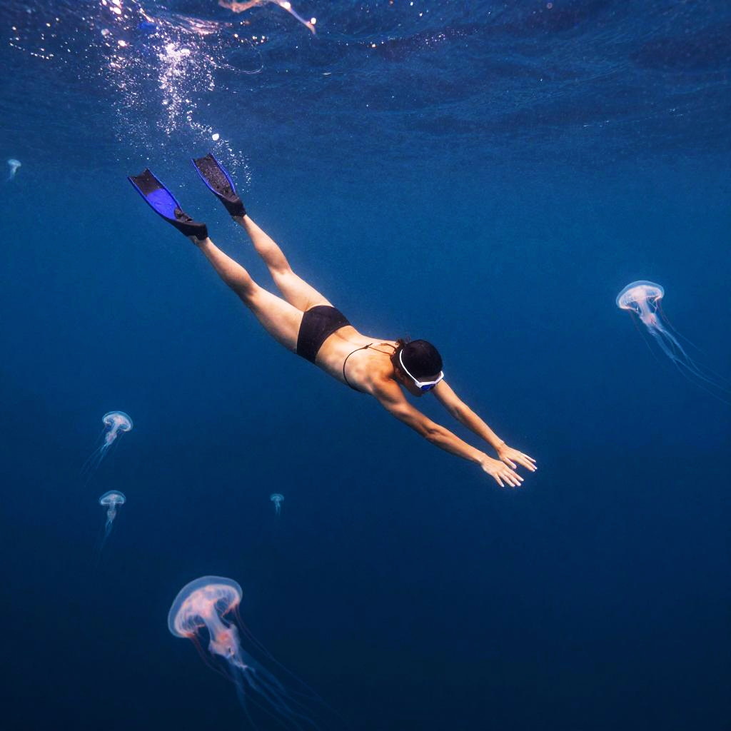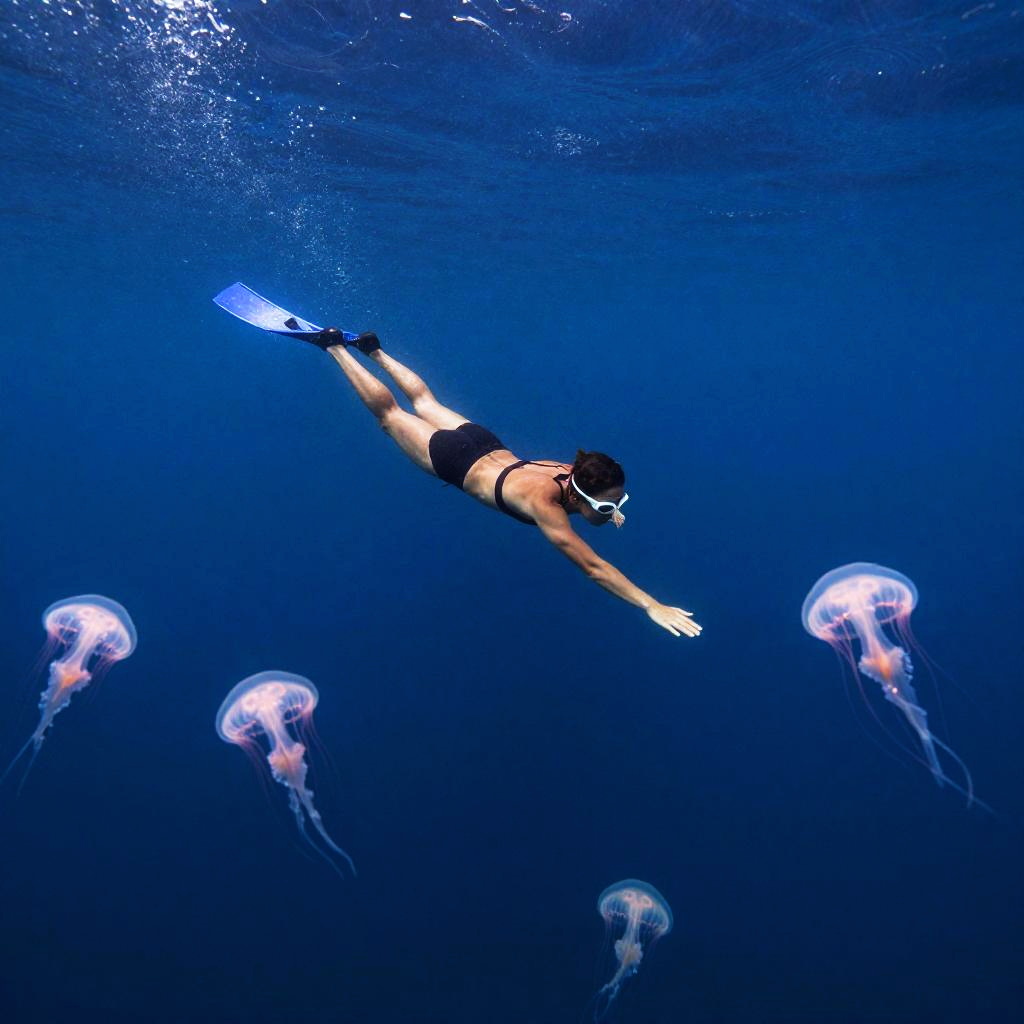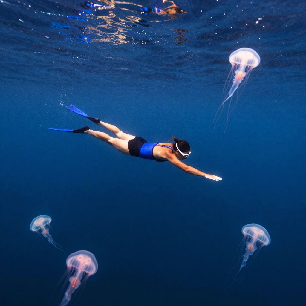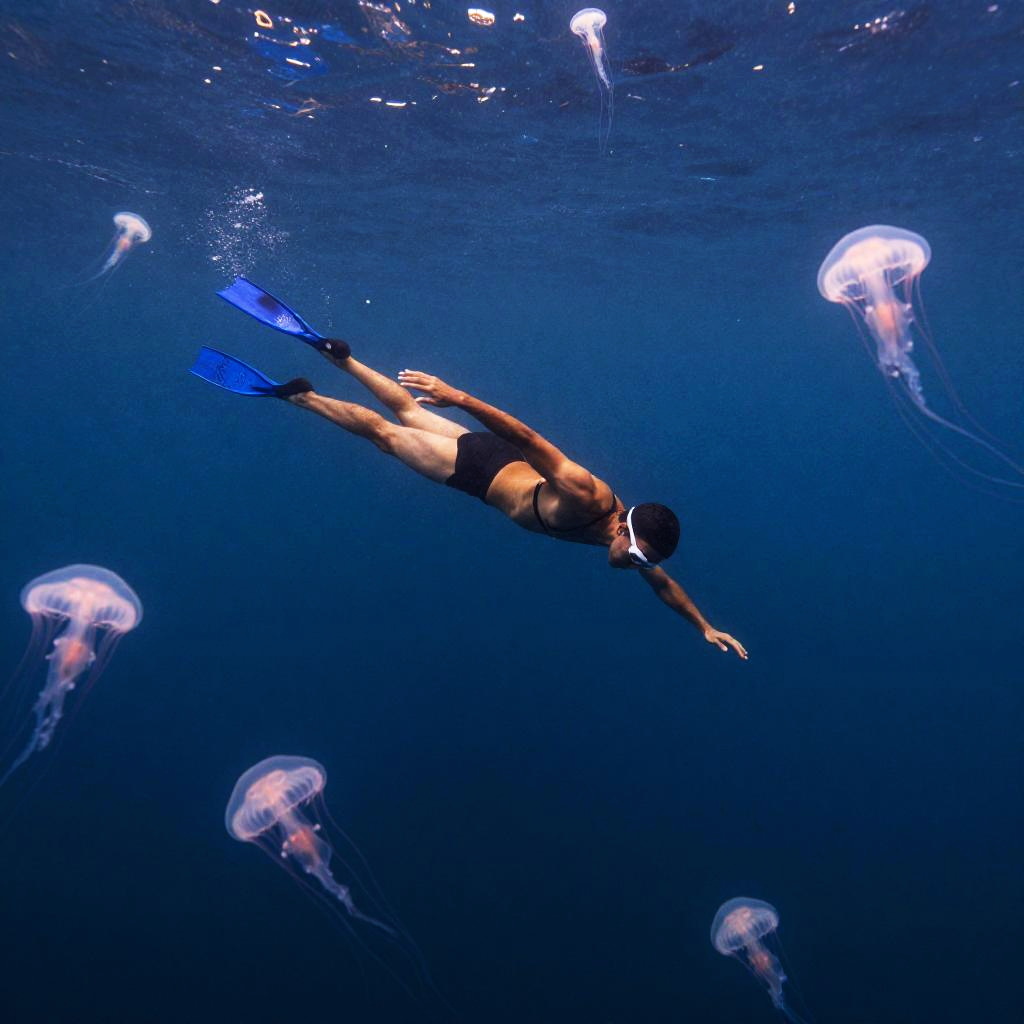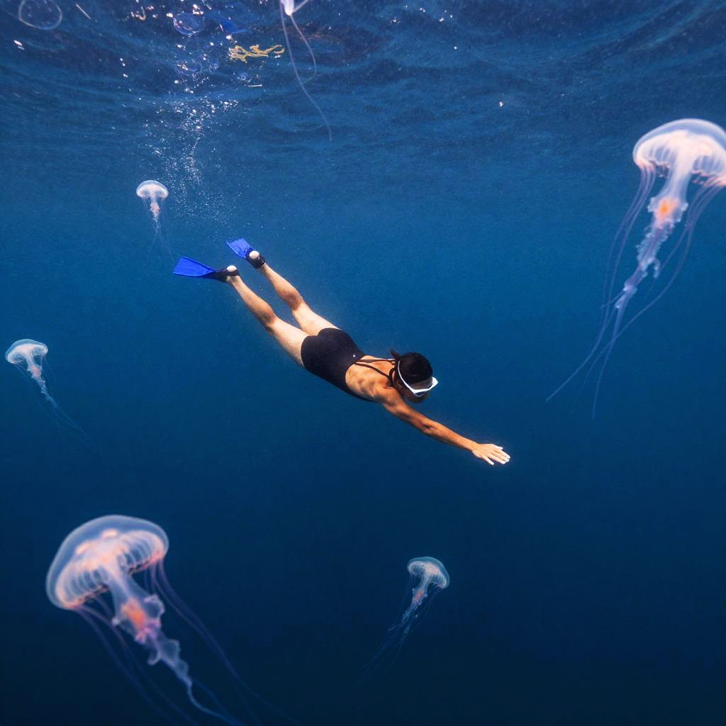The photograph captures a lone swimmer in the ocean surrounded by thousands of neon-colored jellyfish, ultra vibrant shot with an 85mm lens and a shallow depth of field to emphasize the beauty and isolation of the subject. Shot in Super-Resolution and ProPhoto RGB with sharp focus, the image is ultra-realistic, with hyper-realistic textures that enhance the photorealistic detail. The final image is a full-body shot with a cinematic composition.