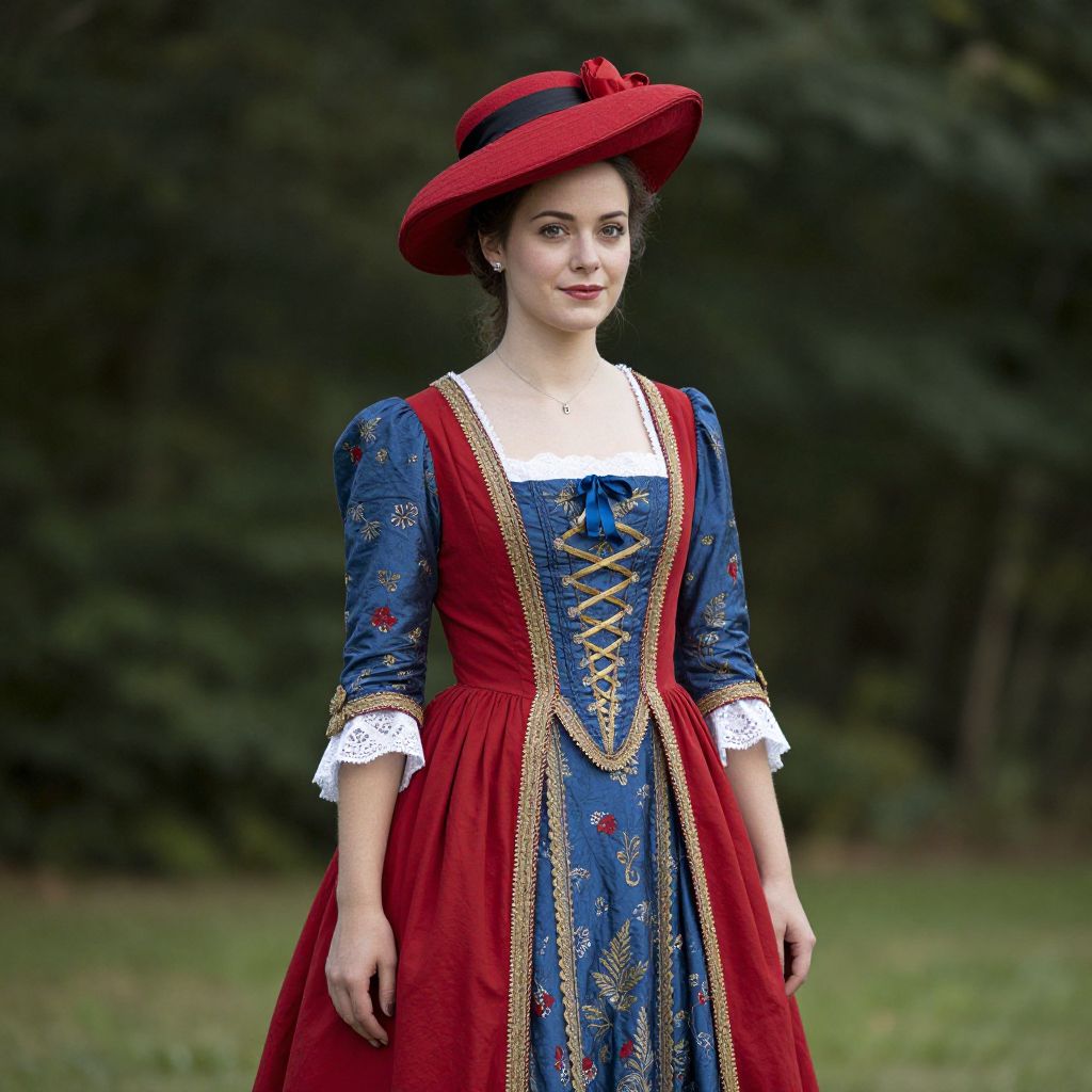 French style costume, woman in a red and blue dress and a red hat