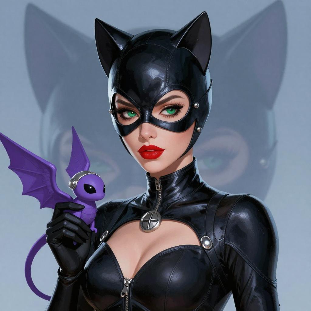 This is a digital illustration of a woman in a sleek, black catwoman-style mask and suit. She has green eyes, full red lips, and a confident expression. Her suit has a glossy texture with a circular emblem on her chest. She's holding a small, purple, winged creature with a metal headpiece. The background is a simple, light blue with dark, shadowy cat ears framing her head.