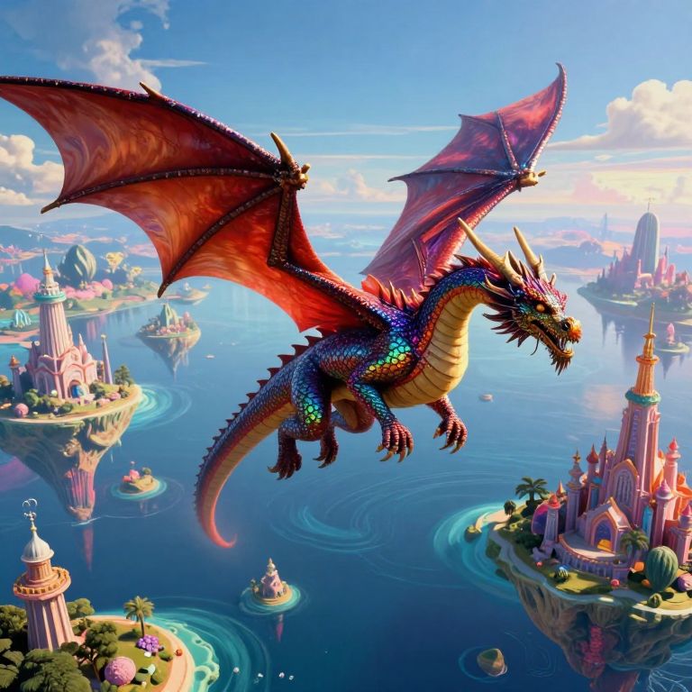 Envision an enchanting digital artwork reminiscent of Salvador Dali's dreamscapes, portraying a regal dragon gracefully soaring through a mesmerizing dreamscape adorned with swirling islands and fantastical architecture. The dragon's scales shimmer with ever-changing hues that dance in the light, casting captivating reflections on the waters below. From an overhead viewpoint, one witnesses the dragon's mighty wings carry it across the sky as the vibrant landscape beneath comes alive, creating a stunning visual harmony that captivates and enthralls the observer.