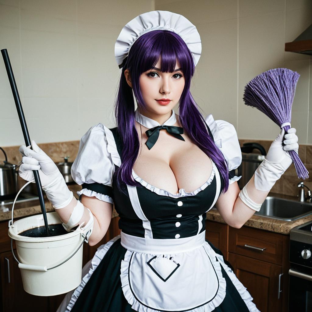 Digital artwork of an anime-style woman in a black and white French maid outfit, holding a mop and bucket in a kitchen. She has long purple hair