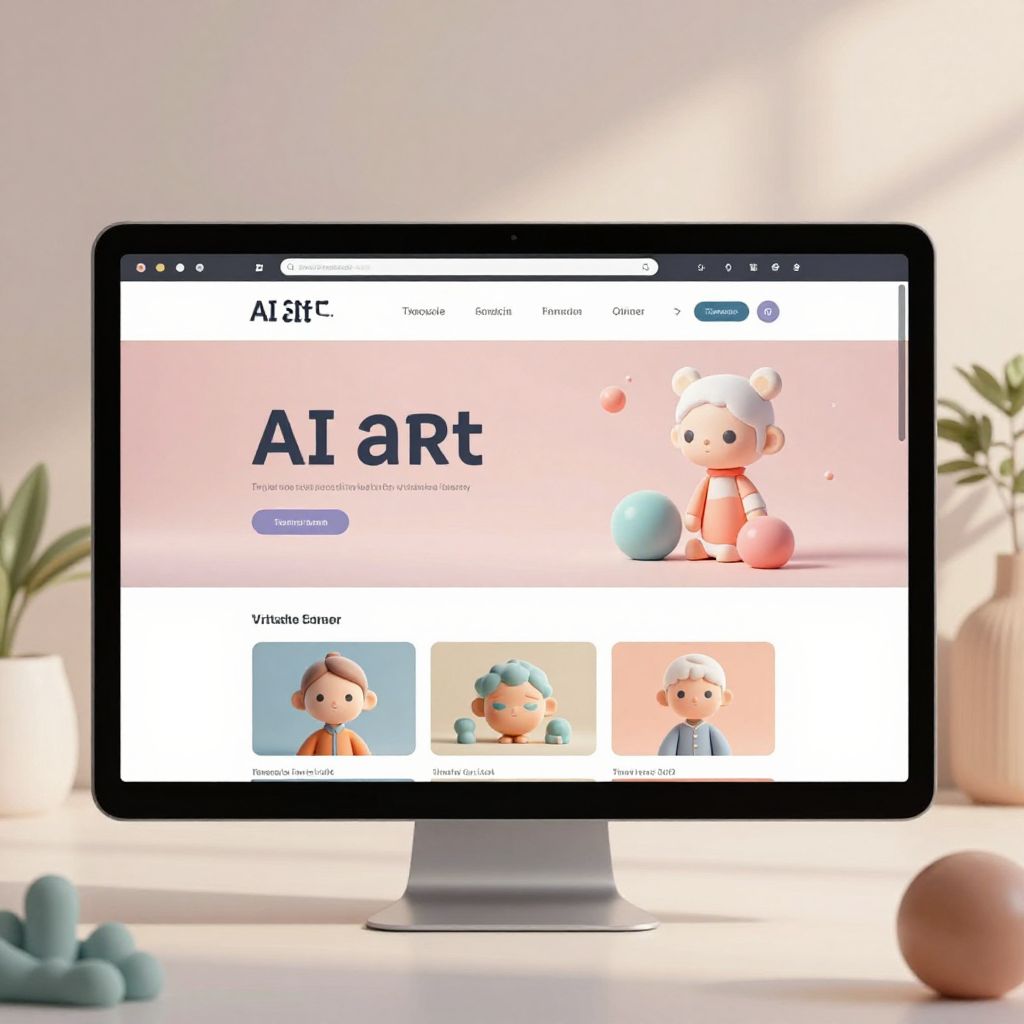 AI art website concept highlighting a virtual gallery filled with AI-created 3D sculptures and digital canvases, immersive user experience with scroll-triggered animations, futuristic font styles and a pastel color palette for a soft tech vibe.