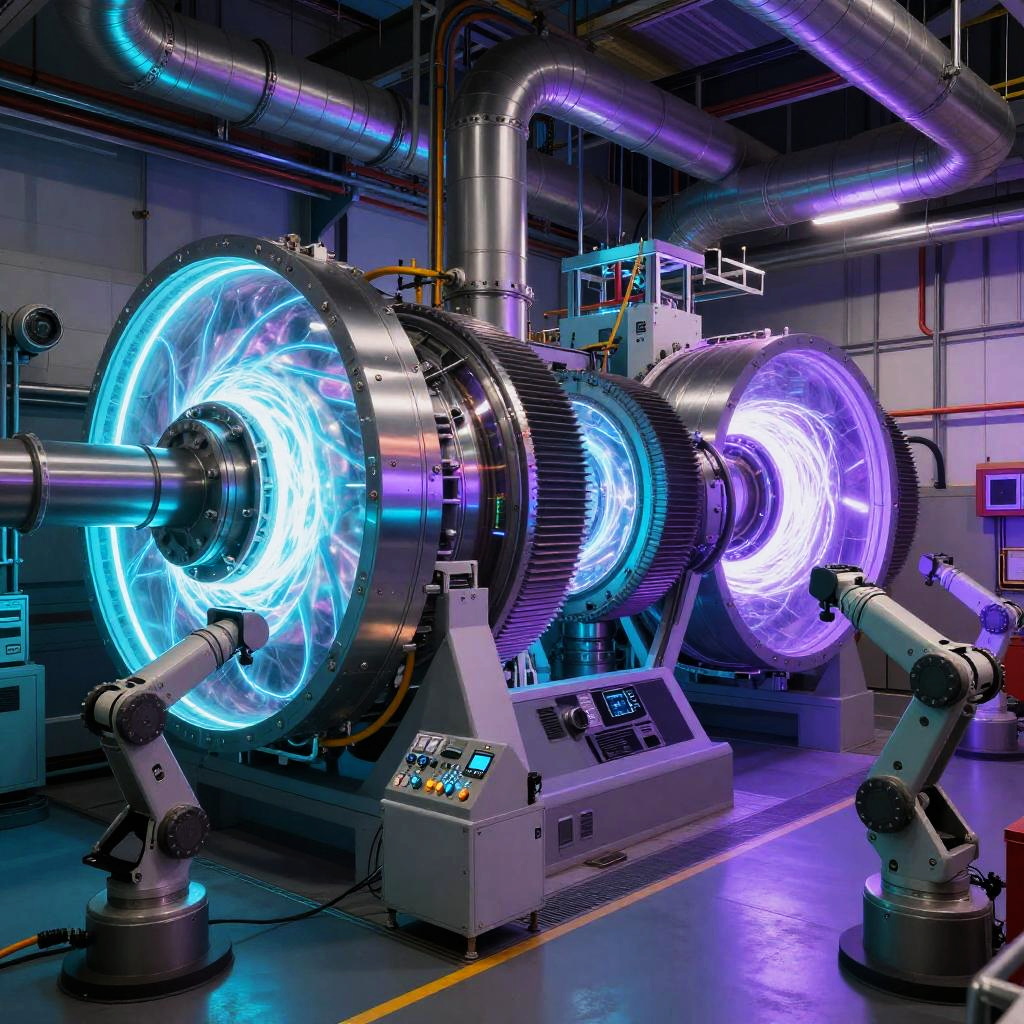 Spaceship engine room glowing with cyan and violet neon lights, complex arrays of pipes and turbines humming with energy, transparent panels revealing swirling plasma cores, futuristic tools and robotic assistants aiding human technicians amid a high-tech industrial environment
