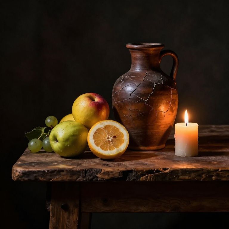 A tenebrism style still life featuring a rustic wooden table laden with fruits, a cracked pottery jug, and a flickering candle, deep shadows dominate the scene with dramatic lighting enhancing textures and colors in rich, dark tones and golden highlights.