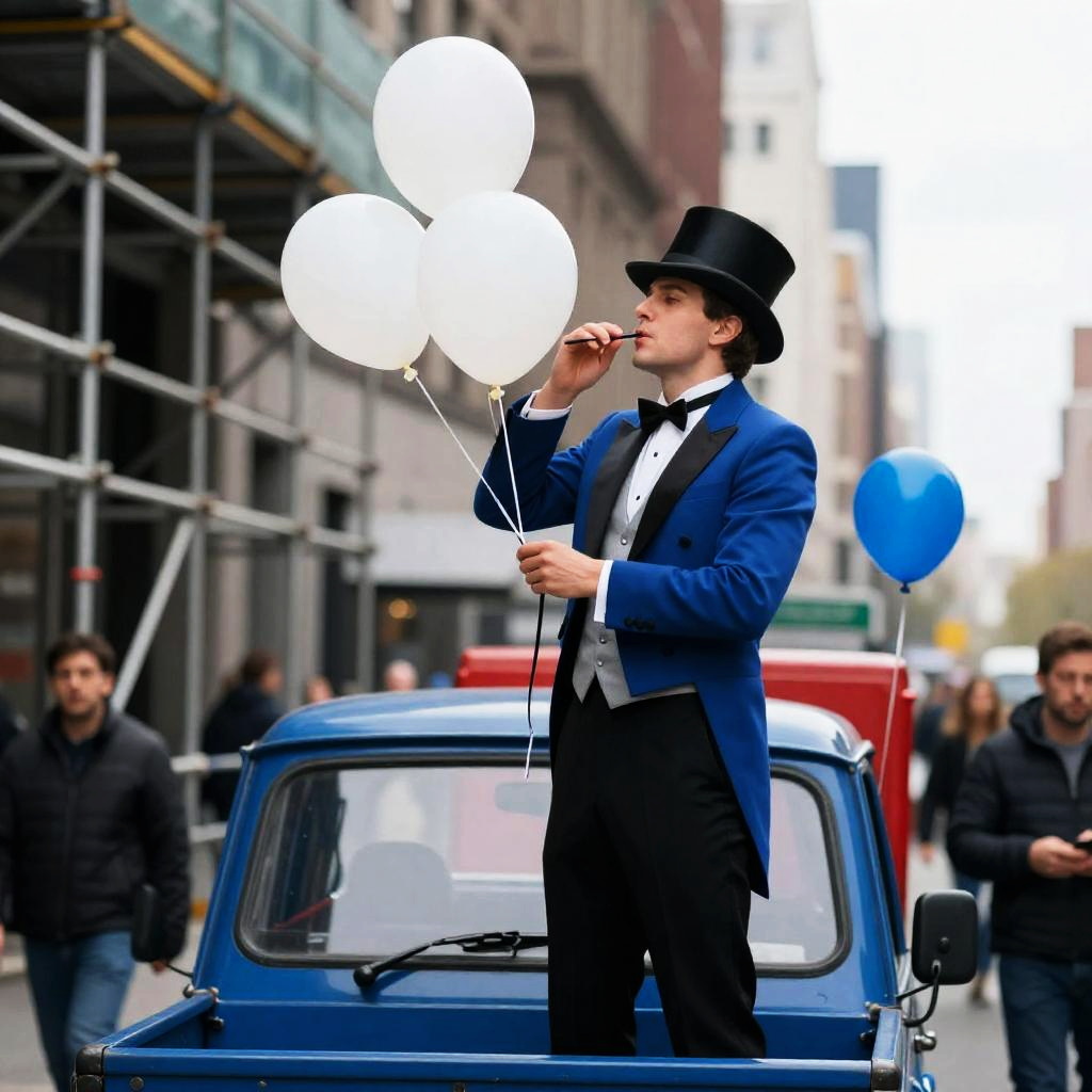 Man in blue tuxedo and top hat, holding black sticks, blowing white balloons, standing on blue truck, urban street background, scaffolding, other people in background, red and blue objects, blurry, overcast lighting, casual crowd.