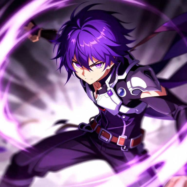 Anime with purple hair boy mid-action in a dynamic battle scene, sharp shadows and dramatic lighting highlighting his focused eyes and flowing hair, futuristic armor with glowing accents, energy effects swirling around him, intense and vivid anime style.