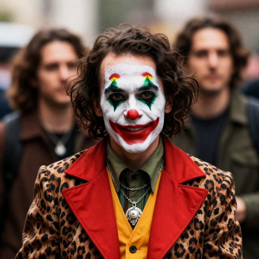 Photograph of two men in a city setting. The man on the left is a clown with white face paint, red shirt, and green sash, gripping the neck of the man on the right, who has dark hair, brown jacket, and shocked expression. Background includes a building with yellow windows, balloons, and trees. Clown's left hand has a large glove. Clown's face shows intensity. Both men are in the foreground, with one hand gripping the other's neck.