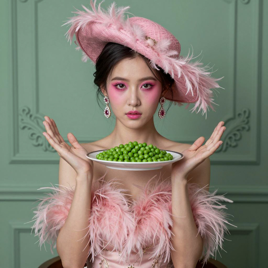Portrait of an East Asian woman with pale skin wearing a pink feathered hat and matching pink feathered dress. She has dramatic pink makeup and sparkling drop earrings. The woman holds a plate filled with green peas, with her hands raised around it. The background features a green ornate wall, and her expression is serious.