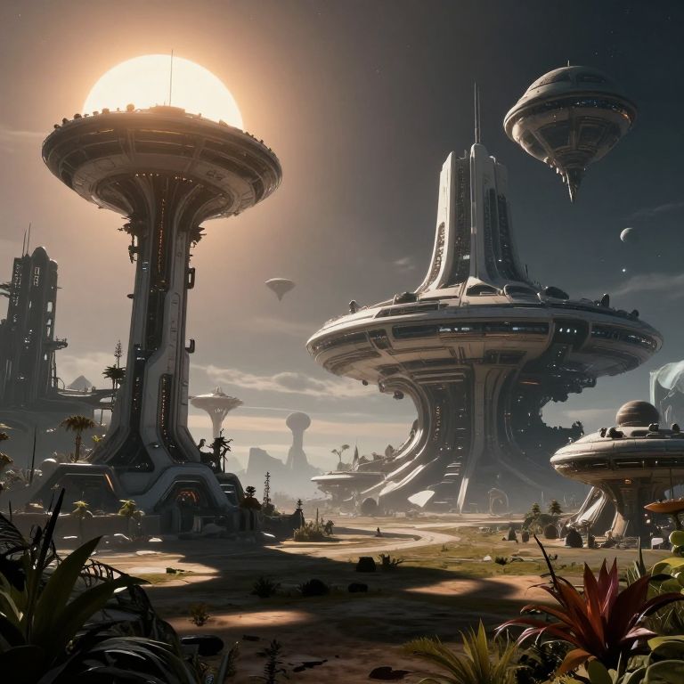 Welten featuring futuristic space colonies on exotic planets, advanced technology structures rising beside alien flora, two suns casting dramatic shadows, cinematic wide-angle view with high contrast and sharp focus, science fiction artwork.