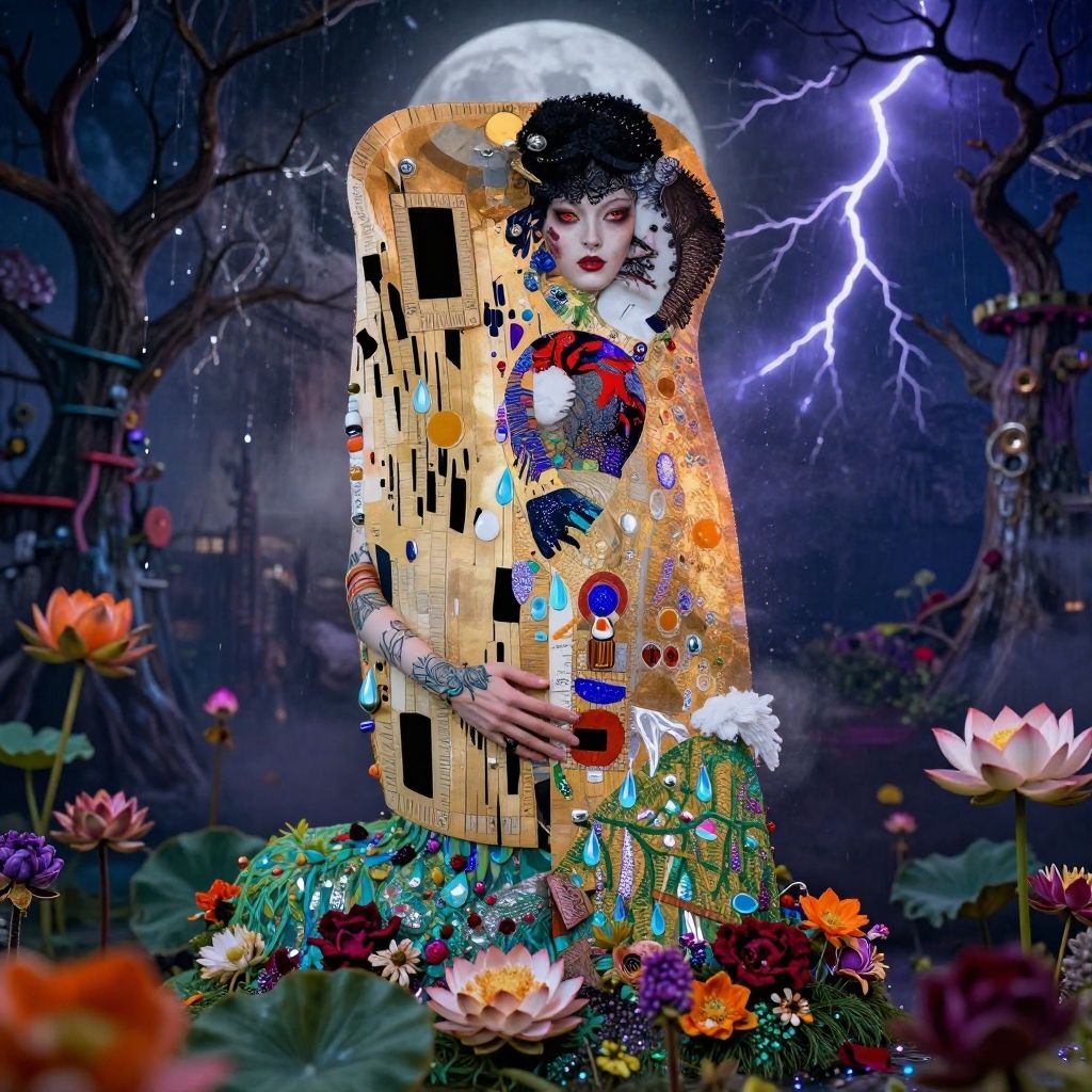 This digital artwork features a woman with pale skin and dark hair, adorned with a mosaic-patterned, golden dress that resembles Gustav Klimt's style. She stands in a mystical forest under a full moon, with lightning illuminating the dark, stormy sky. Her dress is embellished with colorful jewels and blue, red, and black geometric shapes. She holds a smaller, similarly decorated object. Surrounding her are vibrant, detailed flowers in pink, orange, and white, with lush green foliage. The background includes twisted, black tree branches and distant, dimly lit structures. The overall scene blends surrealism with Klimt's Art Nouveau influences.