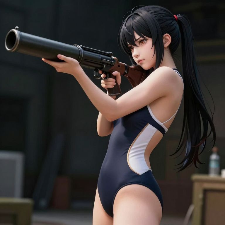 A highly detailed anime girl in a swimsuit is shooting a bazooka on her shoulder, with intricate details and cinematic lighting.