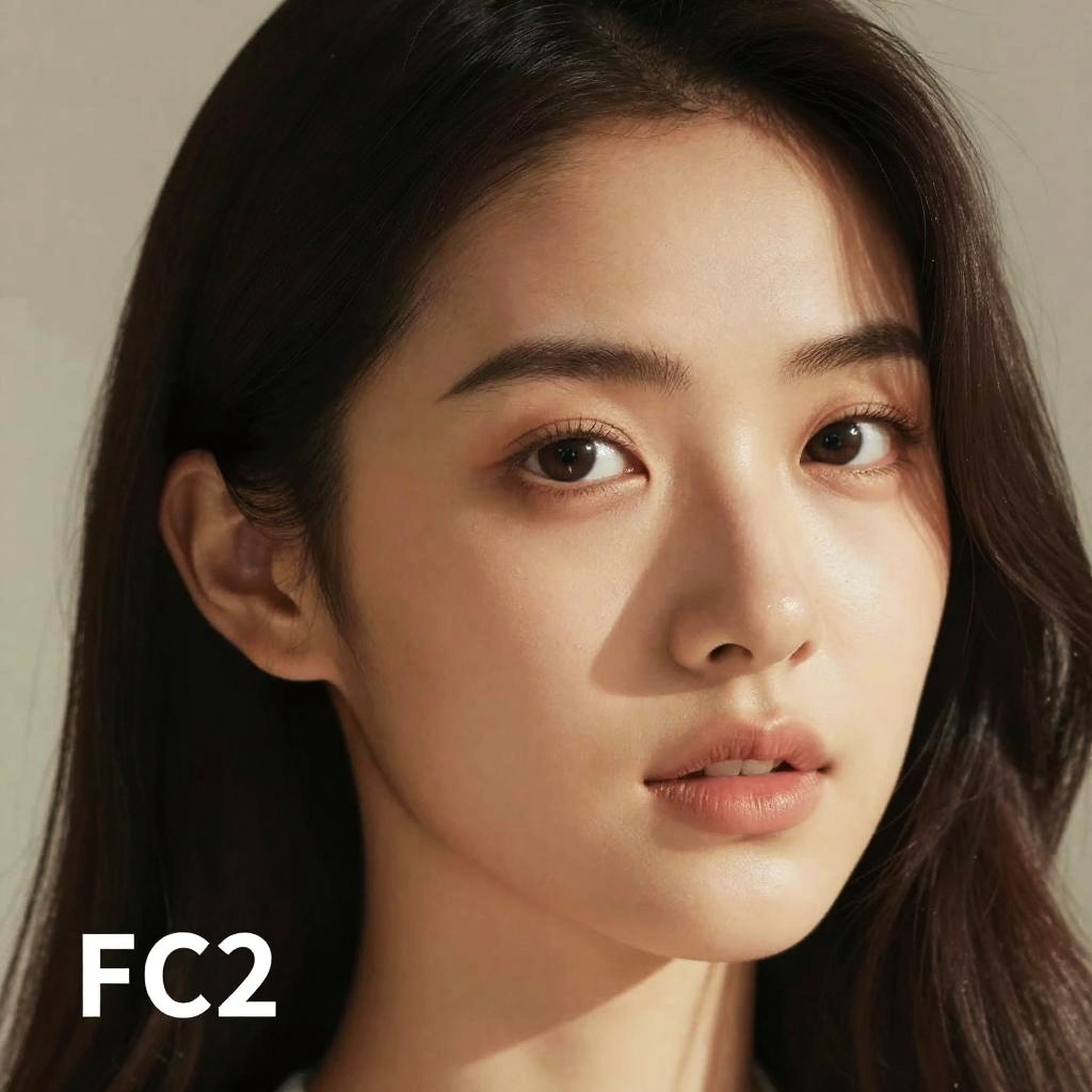 Photorealistic digital portrait of an East Asian woman with long black hair, fair skin, and soft brown eyes, light shadowing. Text "FC