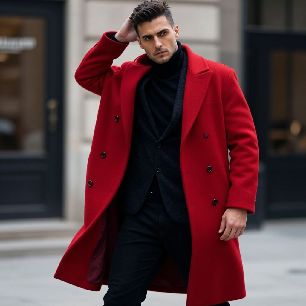This striking image captures a male model confidently posing in an urban setting, showcasing a bold, red coat contrasted against a stylish, dark outfit. The modern street fashion reflects a blend of grit and elegance, making it perfect for fashion-forward editorial features.