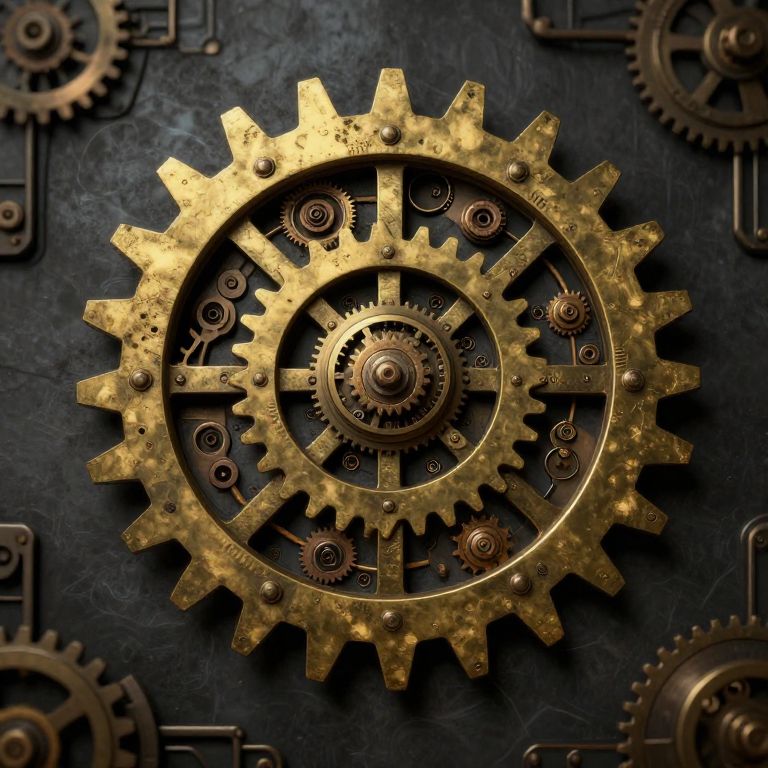 Photograph of intricately detailed, large golden gear with smaller gears inside, set against a dark, textured background with additional gears.