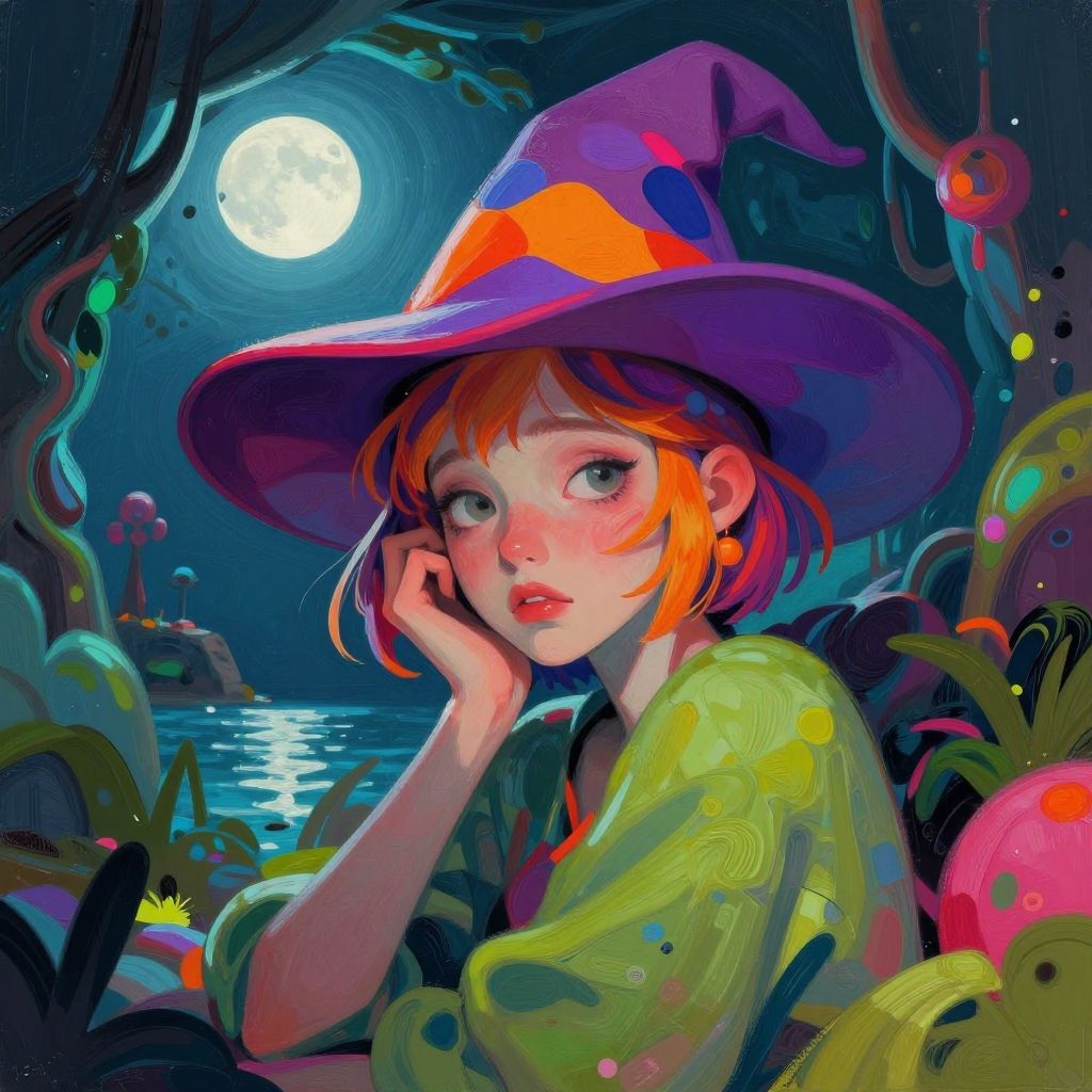 (stylized by Jeremy Mann:1.0), portrait, masterpiece, close up of a tall Prehistoric (Svetlana:1.3), the Girl is very Bewitching and Vibrant, - Atronach hybrid, she is feeling very akward, she is Lounging, her hair is Small and styled as Short, the Girl has a Signature French electric color Wizard Hat, Oppressive Headband, from inside of a Uninspired Pedestrian tunnel, lush water and vegetation, Moon in the night, split diopter, Graphic novel, Fearful, Modern Art, broad lighting, pinhole lens, Primary Colors, biomorphic forms, expressive brush strokes, highly detailed face, realistic cozy face, extremely hyper aesthetic, trending on artstation
