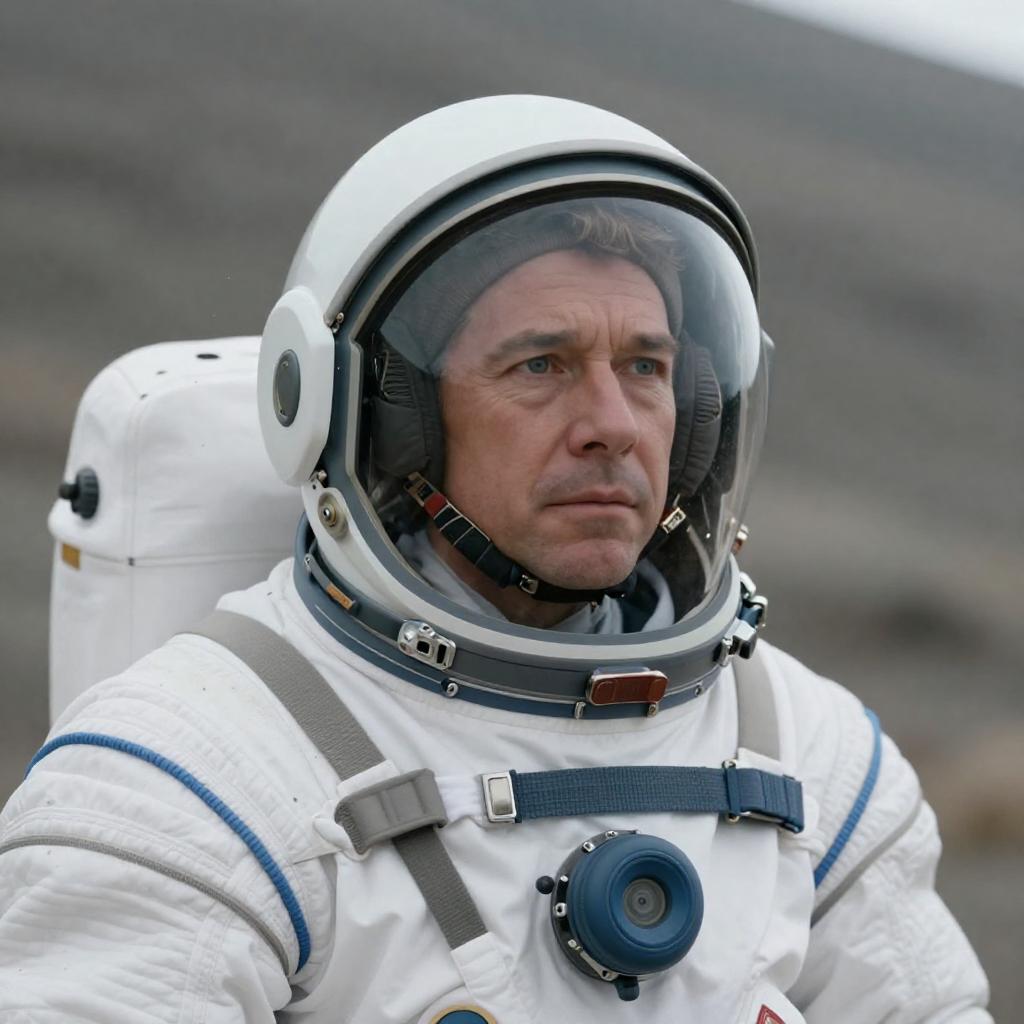 Photograph of a middle-aged man in a white spacesuit with a clear helmet, gray neck seal, and black padding. He has a focused expression, short brown hair, and light skin. The background is a gray, rocky, outdoor landscape with falling particles. He is positioned slightly to the left, looking to the right.