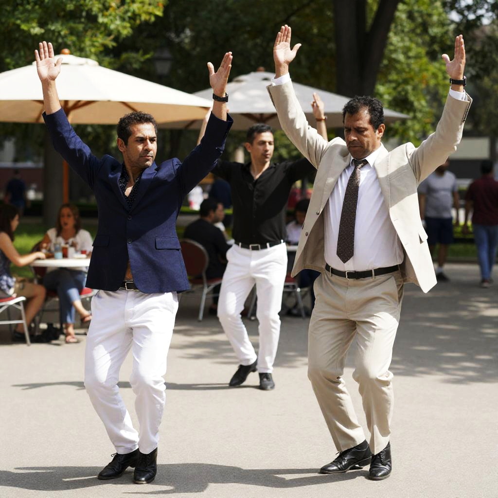 Photograph of two men in dynamic mid-air punches. Left man with dark curly hair, brown vest, white shirt, green pants. Right man with blonde hair, black vest, white shirt, blue pants. Both with intense, open-mouthed expressions. Background shows ornate architectural structure with circular patterns. Bright daylight.