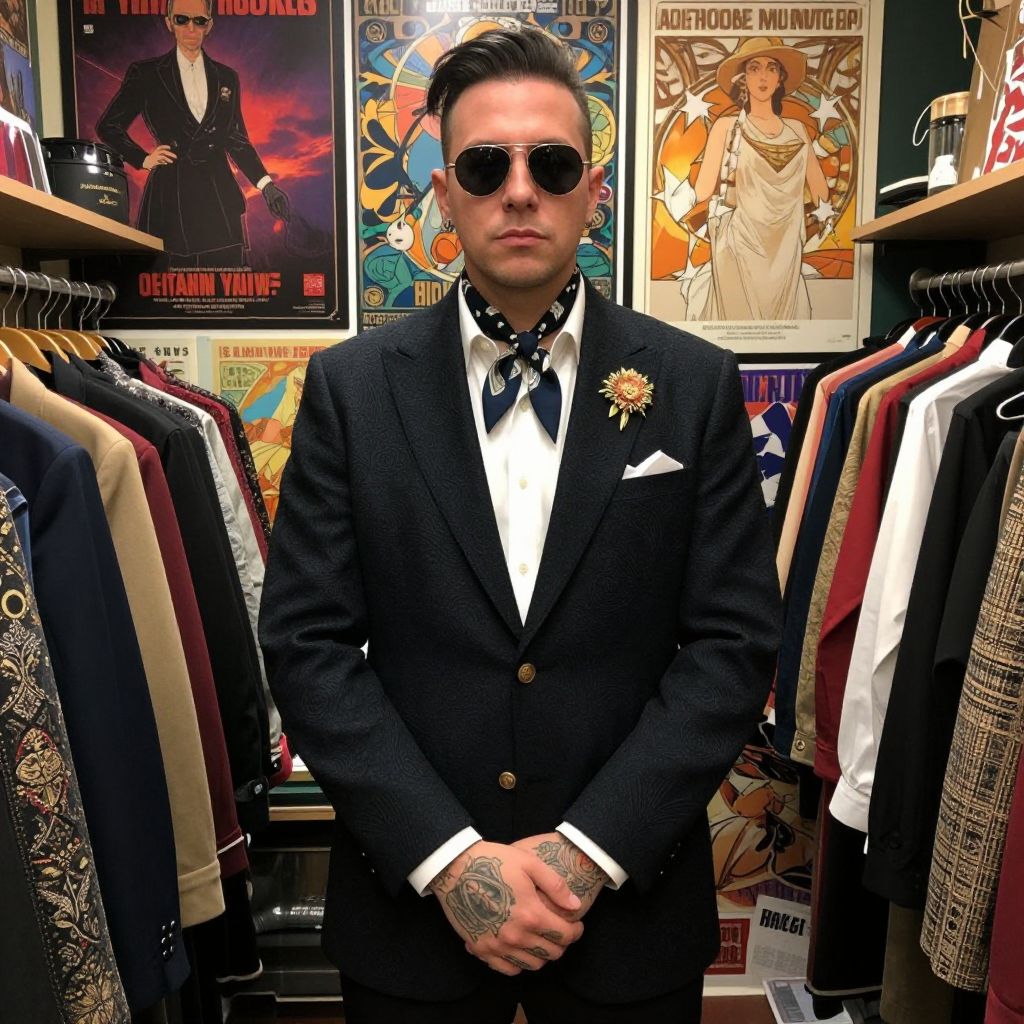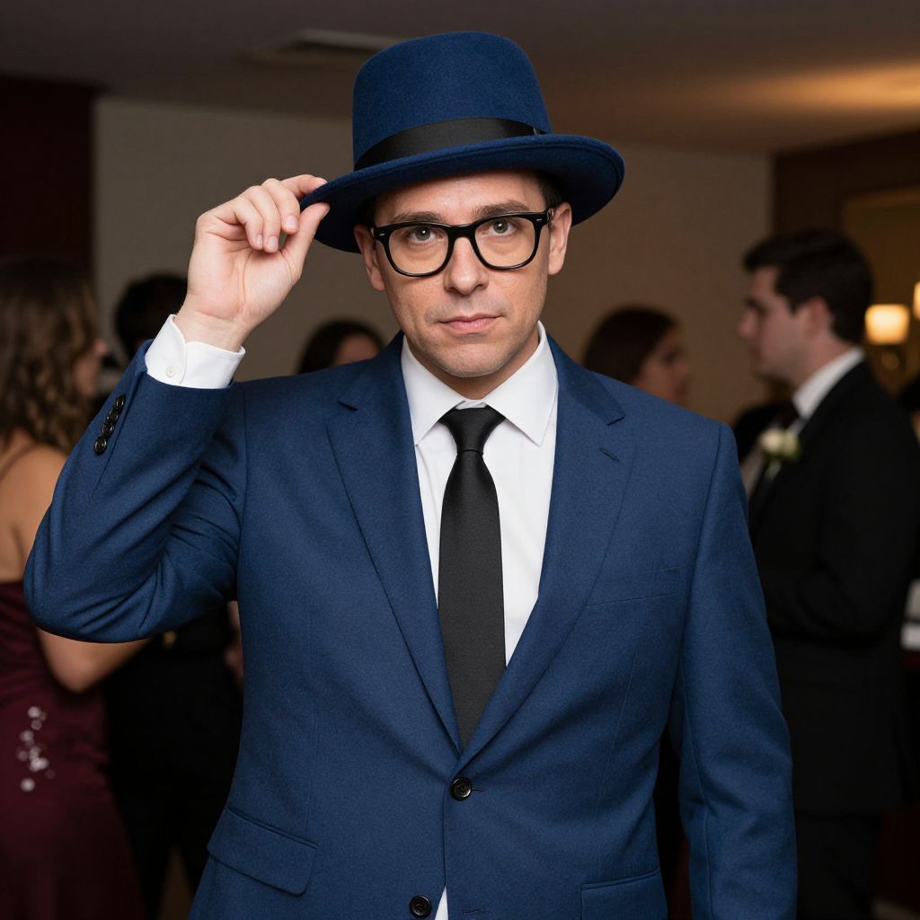 Photograph of a suave man in a navy suit, black tie, and fedora, adjusting his hat with glasses, in a dimly lit