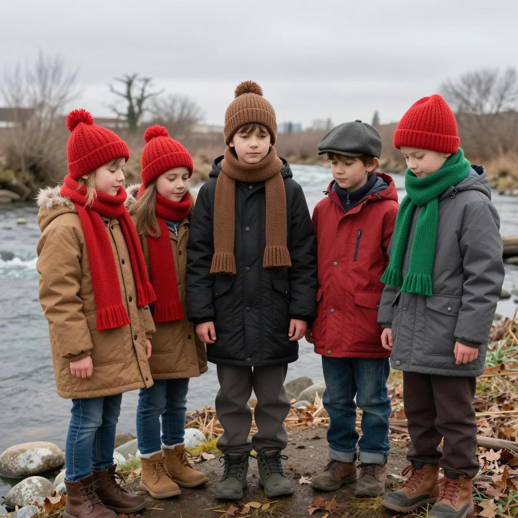 Two children in a car, close-up. The girl with red hair, blue eyes, wearing a colorful striped shirt, leans against the boy. The boy, with a red beanie and red and gray jacket, looks to the right. Cityscape through the window in the background. The boy's jacket has a red and yellow star on the chest.