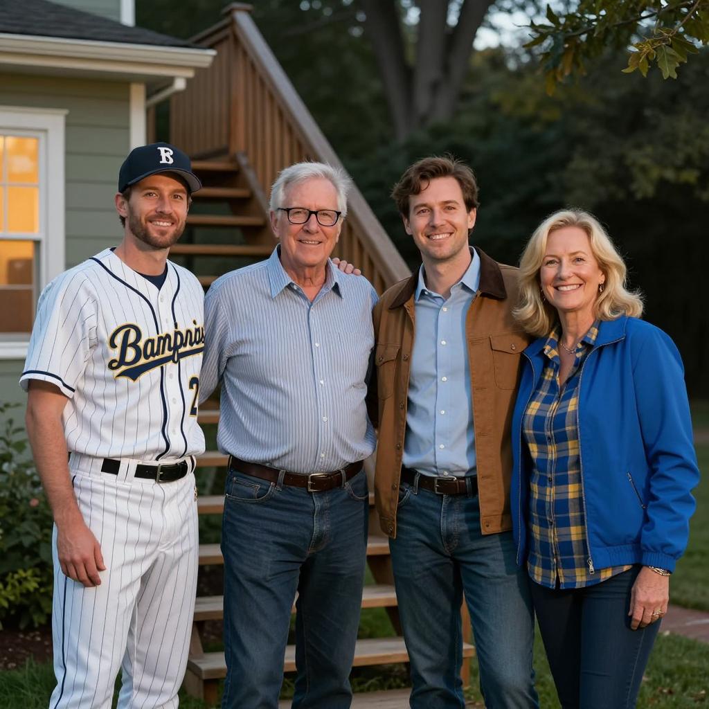 A family photo with a large, elderly man in a fur costume, smiling widely. He stands in the center, surrounded by four people: a young boy with blond hair and a blue shirt on his right shoulder, a woman with light brown hair and a blue top on his left, a woman with blonde hair and a beige cardigan in front, and a bald man with gray hair and a white shirt on his right. They are outdoors in front of a wooden porch with railings and a potted plant in the background. The man's fur costume has large, fluffy patches on his shoulders.